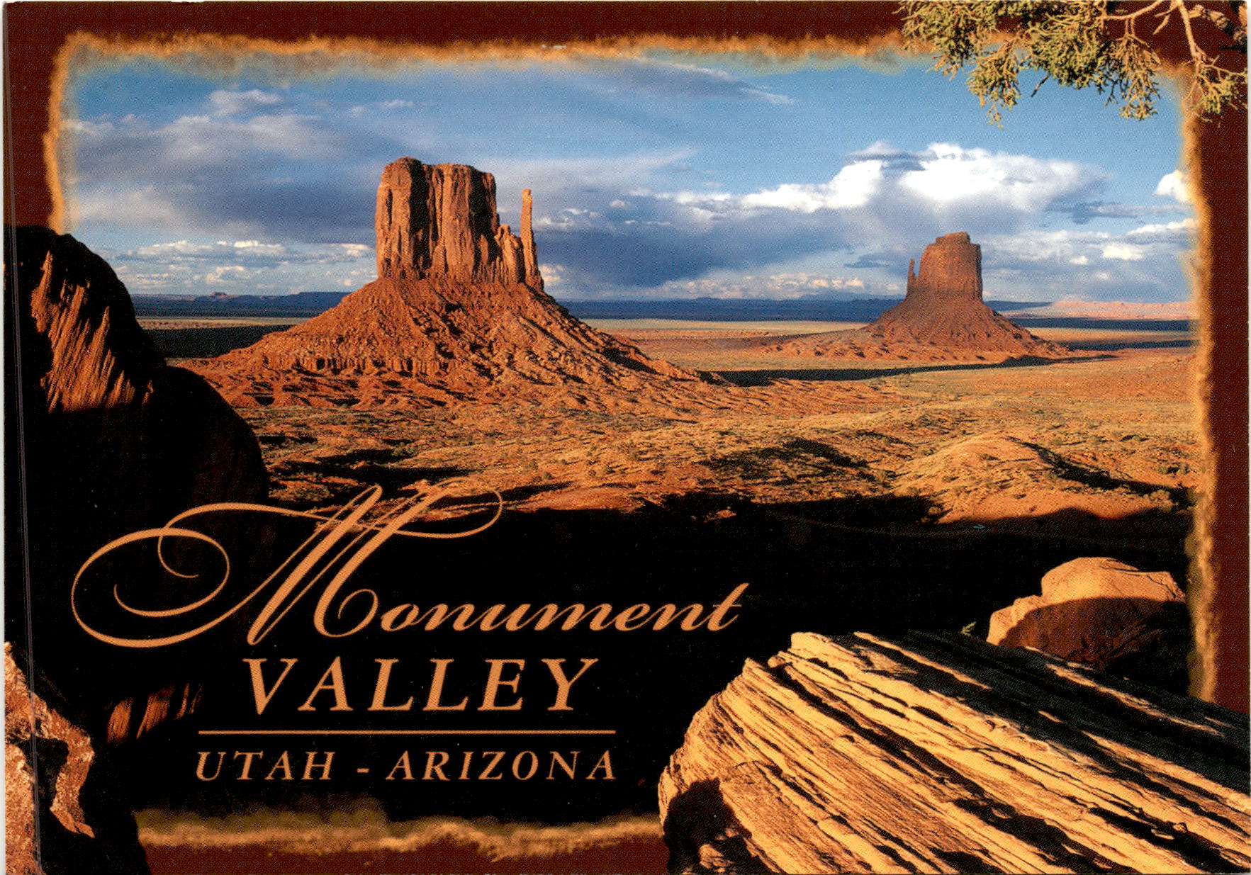 The postcard features a stunning image of Monument Valley, located on the Utah-Arizona border. The iconic ‘mittens’ rock formations are showcased in the picture, which have been used as a backdrop for numerous films and commercials. The postcard was designed and printed in the USA by John Hinde Curteich, with the photo taken by Mitch Adams and published by Seaich Card & Souvenir Corp.