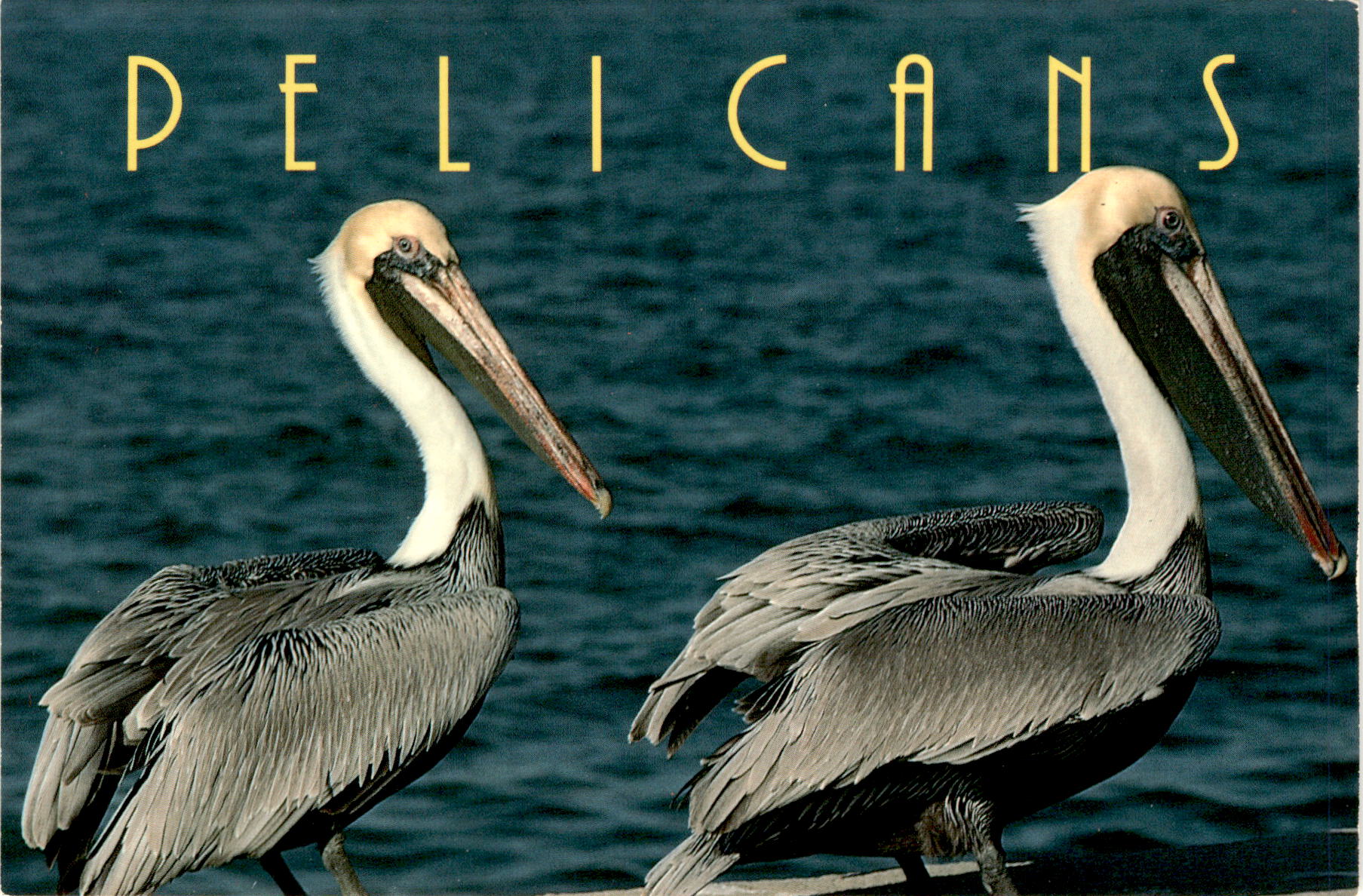 Overall, the postcard captures the contrast between the clumsy behavior of pelicans on the ground and their graceful flight in the air, highlighting the beauty and uniqueness of these fascinating birds.