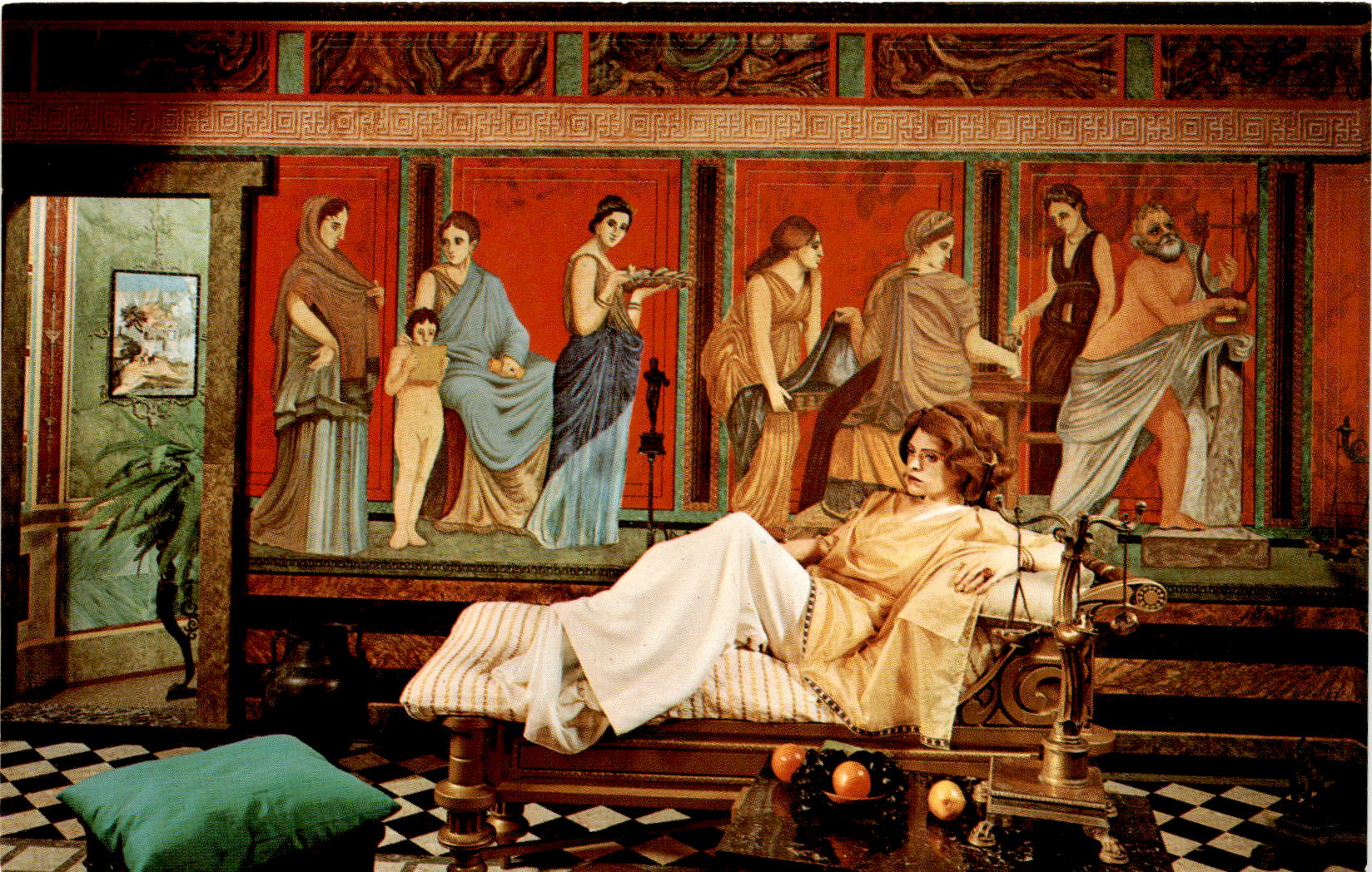 The postcard features the Pompeiian Room exhibit at the Milwaukee Public Museum in Milwaukee, Wisconsin. It showcases the living room and atrium of the Villa of the Mysteries in Pompeii, recreating the splendor of the Roman Empire. The wall fresco depicts initiation ceremonies for a cult of Dionysis, offering a glimpse into ancient Roman culture.