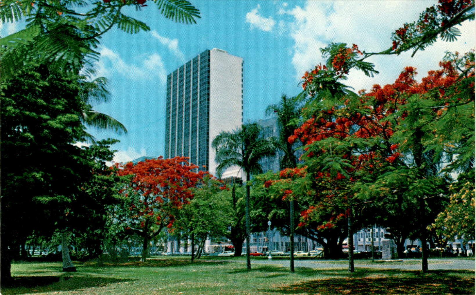 Overall, the postcard captures the beauty and vibrancy of Miami’s urban landscape, showcasing the juxtaposition of modern architecture against the natural beauty of the Royal Poinciana Tree’s fiery red blossoms.