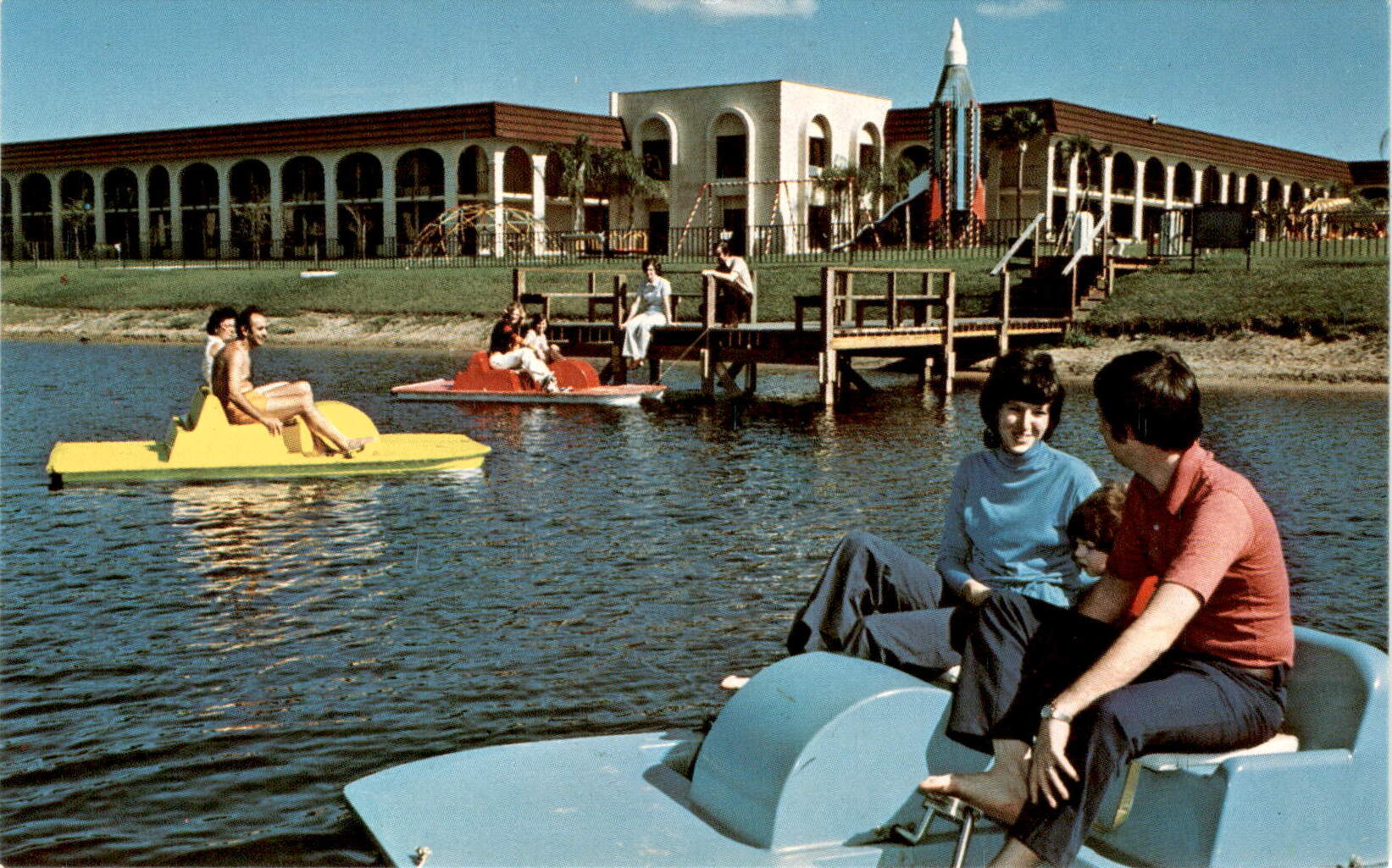 Back of PostcardThe postcard advertises the Sheraton-Lakeside Inn in Kissimmee, Florida, located 1.8 miles from the entrance to Walt Disney World. The inn offers a restaurant, cocktail lounge, lakefront view, swimming pools, kiddies playground, recreation room, paddleboats, shuffleboard, basketball, fishing, color TV, and Herbie’s Ice Cream parlor.