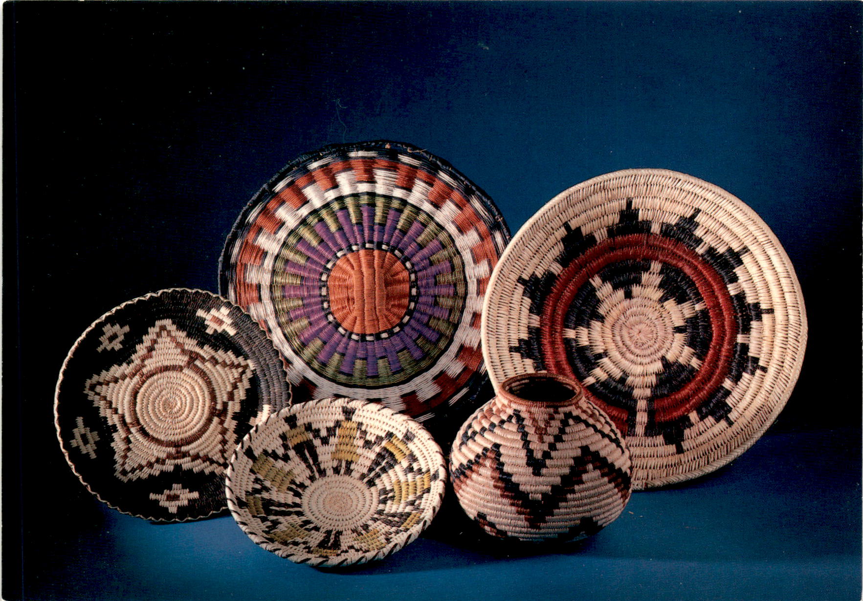 The postcard showcases various Southwest Indian baskets, representing tribes such as Hopi, Navajo, Seri, and Tohono O’odham. These baskets range in size from nine to fifteen inches in diameter and are considered the oldest of Southwest Indian crafts. The postcard is provided by The Heard Museum in Phoenix, Arizona.