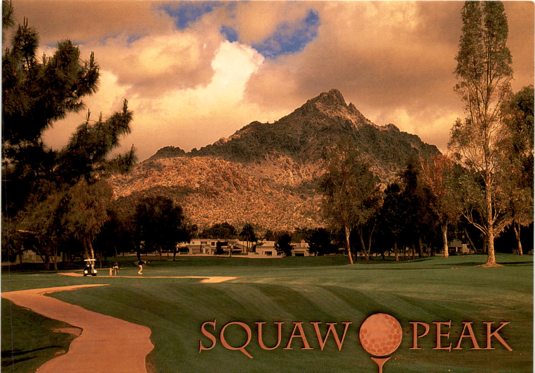 The postcard features a stunning image of Squaw Peak in Arizona, just northeast of downtown Phoenix. It highlights the peak as a popular destination for hiking and horseback riding, as well as providing a picturesque backdrop for the resorts and golf courses in the Valley of the Sun.