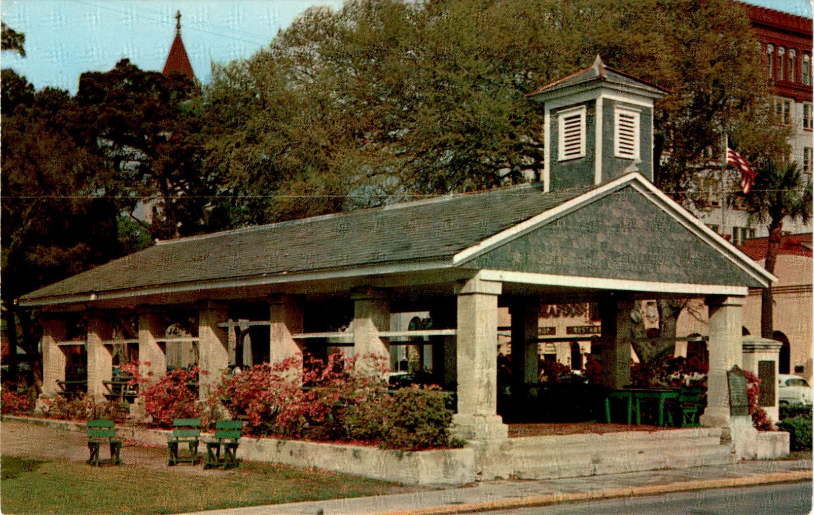 The postcard features a picture of The Old Market in St. Augustine, Florida, which is known as the oldest city in the United States. The Market, located in the Plaza, faces Matanzas Bay and was established in 1598 by the Spanish Governor as the first public market and standard system of weights and measures. The current structure dates back to 1824.