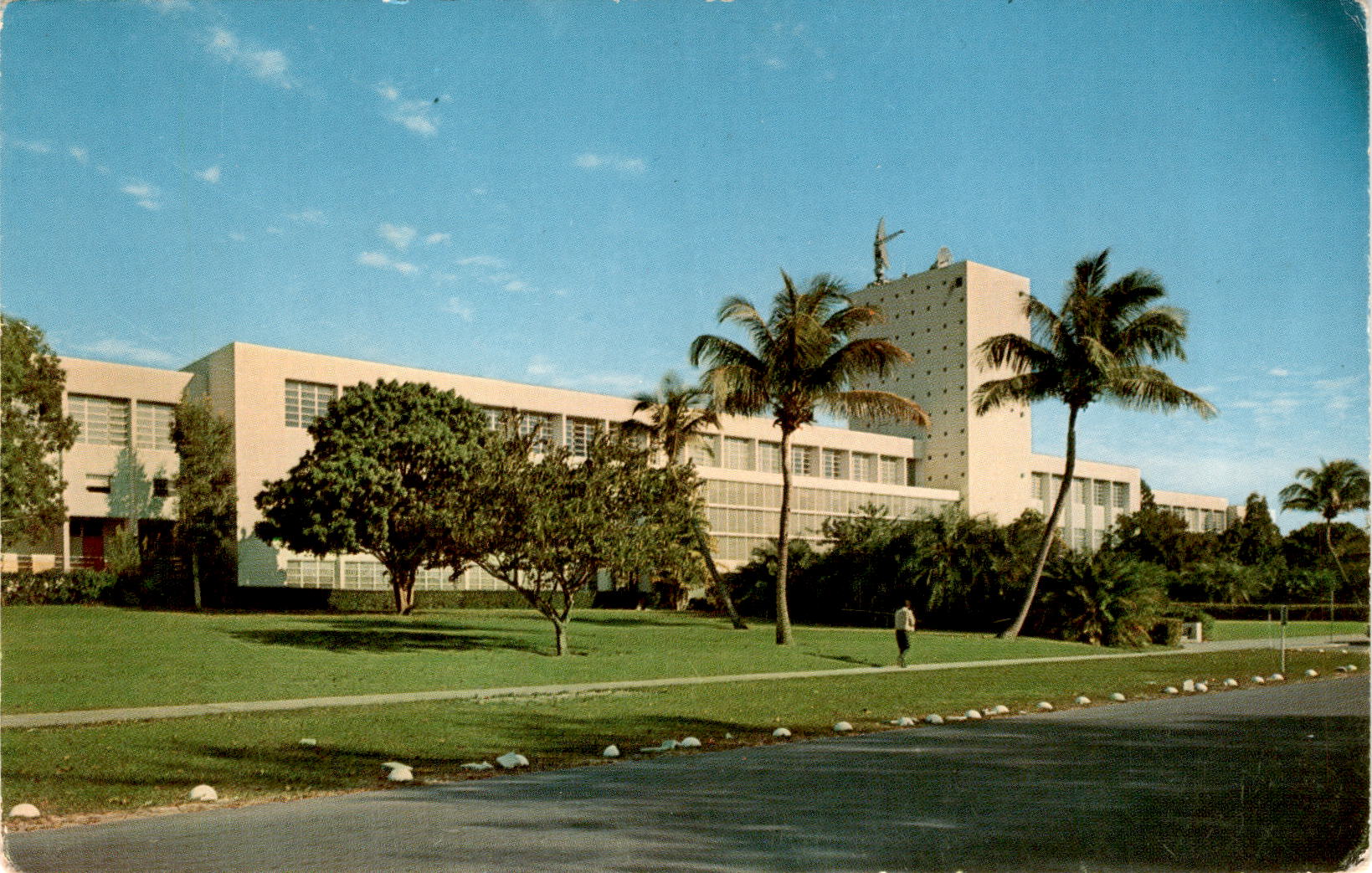 The postcard showcases the Merrick Building at the University of Miami in Coral Gables, Florida. The building exemplifies modern design and houses classrooms, offices of the School of Education, Evening Division, International Center, Bookstore, and part of the General Library. Radar equipment on the tower is operated by the meteorological department on the top two floors.