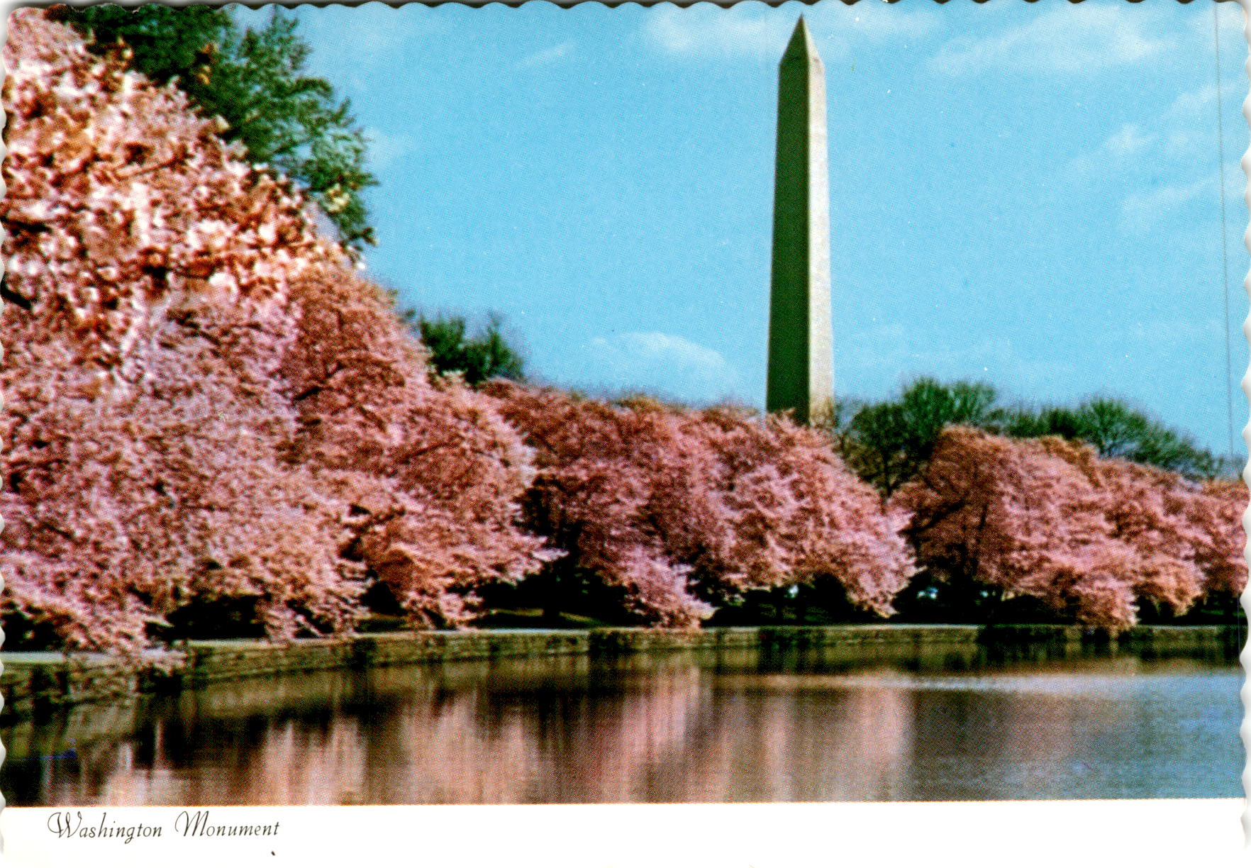 The cherry trees mentioned in the postcard are a significant part of the landscape around the Washington Monument. These cherry trees were a gift from Japan in 1912 as a symbol of friendship between the two nations. Every year, the National Cherry Blossom Festival is held in Washington D.C. to celebrate the blooming of these trees, attracting visitors from around the world.