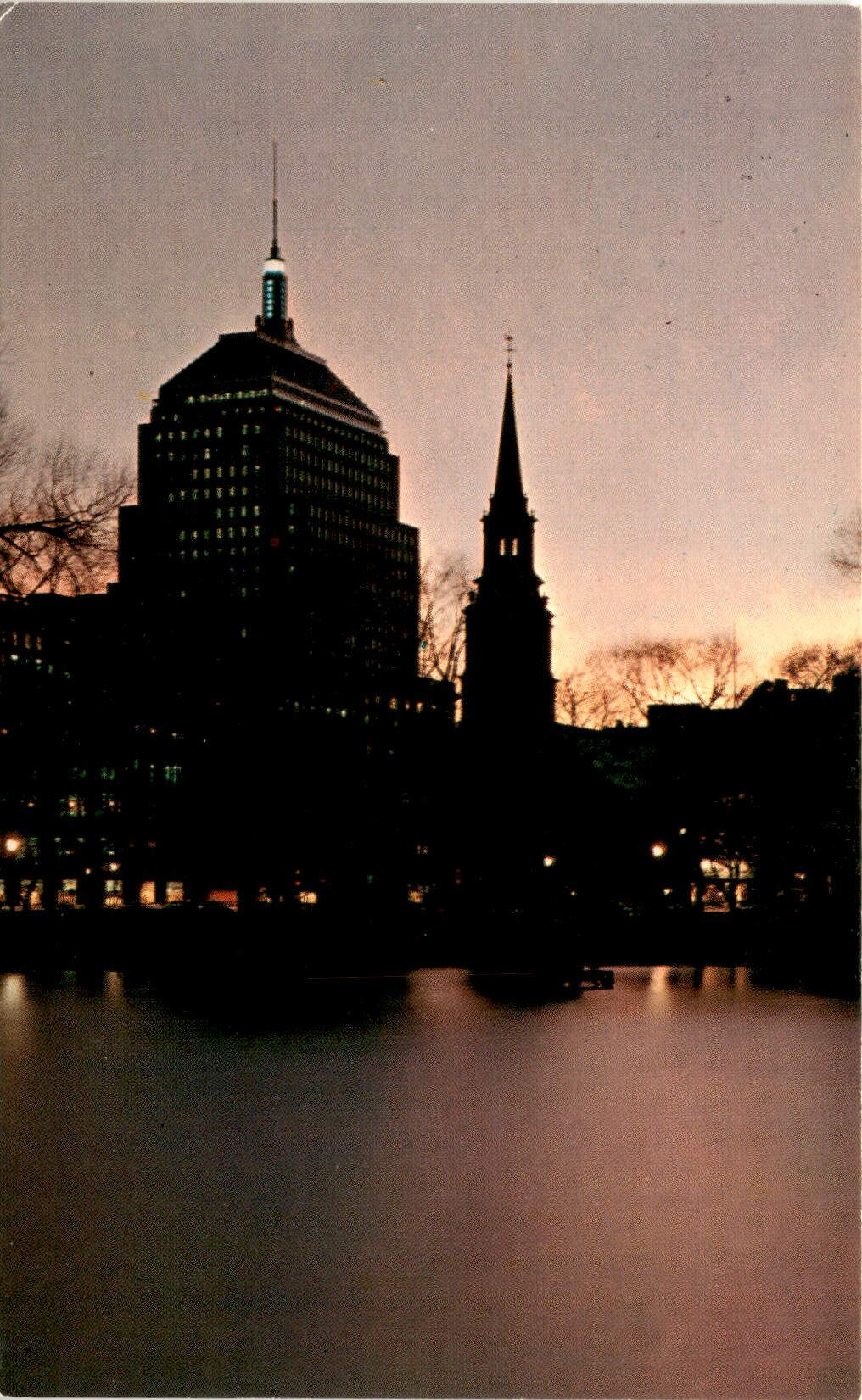 Are you looking for a picturesque spot to visit in Boston at twilight? Look no further than the Public Gardens, where you can enjoy the stunning view of the Arlington Street Church and the Home Office of the John Hancock Mutual Life Ins. Co. with the Weather Forecast Tower. Visitors are invited to the Observation Areas Monday through Friday from 9:30 a.m. to 4 p.m. Take in the beauty of the city as the sun sets and enjoy the peaceful atmosphere of this historic location.Planning your visit to the Public Gardens and want to know what the weather will be like? Keep an eye out for the Weather Forecast Tower, where you can get a glimpse of the weather conditions 3 hours from now. Remember the old saying: Steady blue, clear view. Steady red, rains ahead. Flashing blue, clouds due. Flashing red, snow instead. Whether you’re a local or a tourist, this unique feature adds an element of fun and anticipation to your visit.Capture the beauty of Boston at twilight with a postcard from the Public Gardens. This stunning image of the city skyline is brought to you by COLOURPICTURE PUBLISHERS, INC., based in Boston, Massachusetts, U.S.A. Share the magic of this iconic location with your loved ones by sending them a postcard featuring the breathtaking view of the city at dusk. Don’t forget to put a stamp on it and send it off to make someone’s day a little brighter.