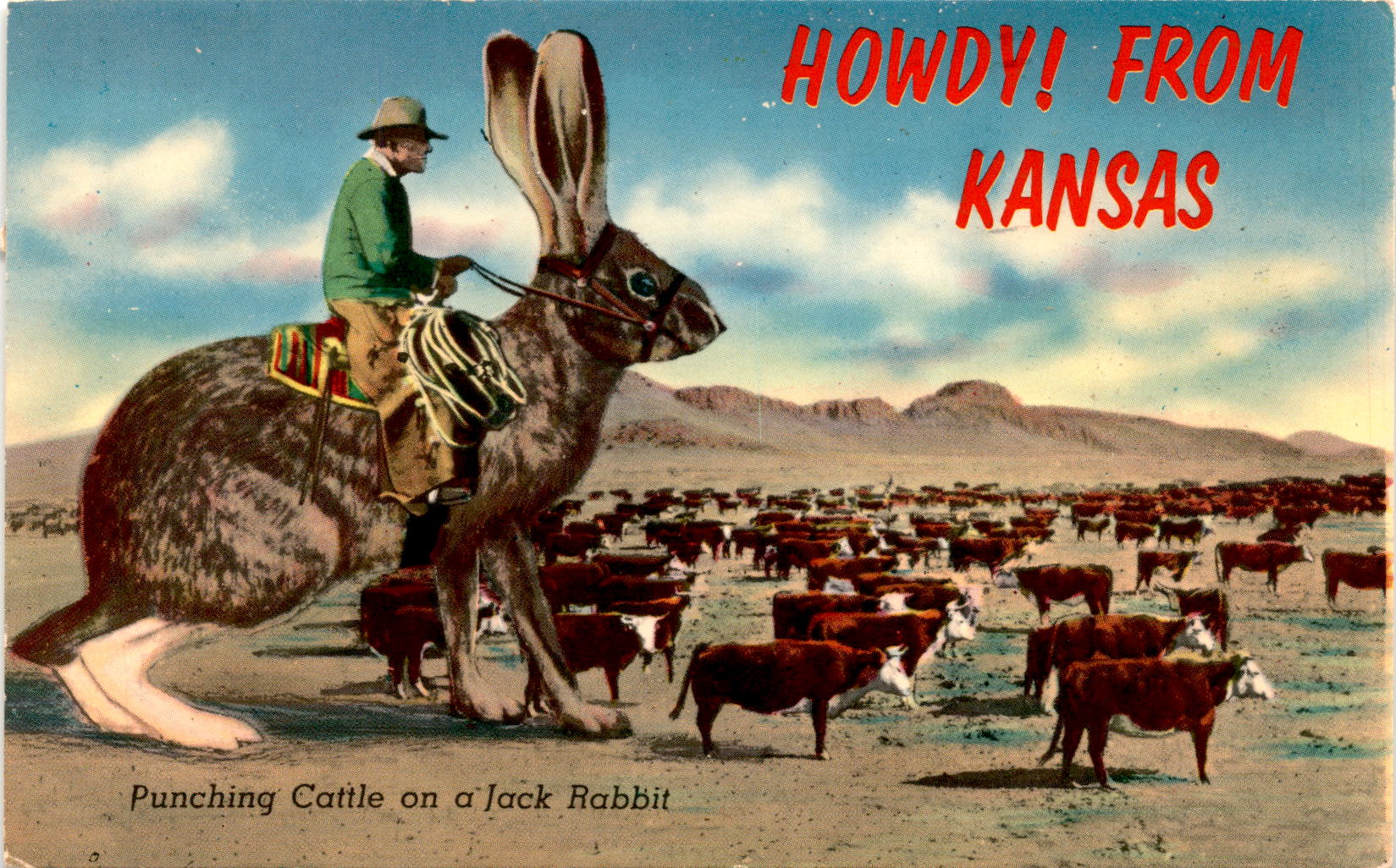 Howdy from Kansas! Out here in the West, punching cattle is a way of life. While some cowboys do it on Broncs, others, as you can see, do it on the lowly Jack Rabbit. It takes skill and precision to handle these fast and agile creatures, but for those who are up to the challenge, it’s a thrilling experience.In 1968, an earthquake shook St. Louis, but that didn’t stop the cowboys from Dunlap-Henline Co. in North Platte, Nebraska from continuing their work. They sent a postcard to Miss Lori Ann Winston in Dallas, Texas, letting her know that they were on their way to Denver via Hayes, Kansas. Despite the challenges they faced, they remained dedicated to their job and were grateful for the well wishes from their loved ones.Punching cattle on a Jack Rabbit may not be the most conventional way of herding, but for these cowboys, it’s just another day on the job. With determination and a love for the land, they continue to carry on the traditions of the Wild West. So next time you see a cowboy on a Jack Rabbit, tip your hat to them for their hard work and dedication.