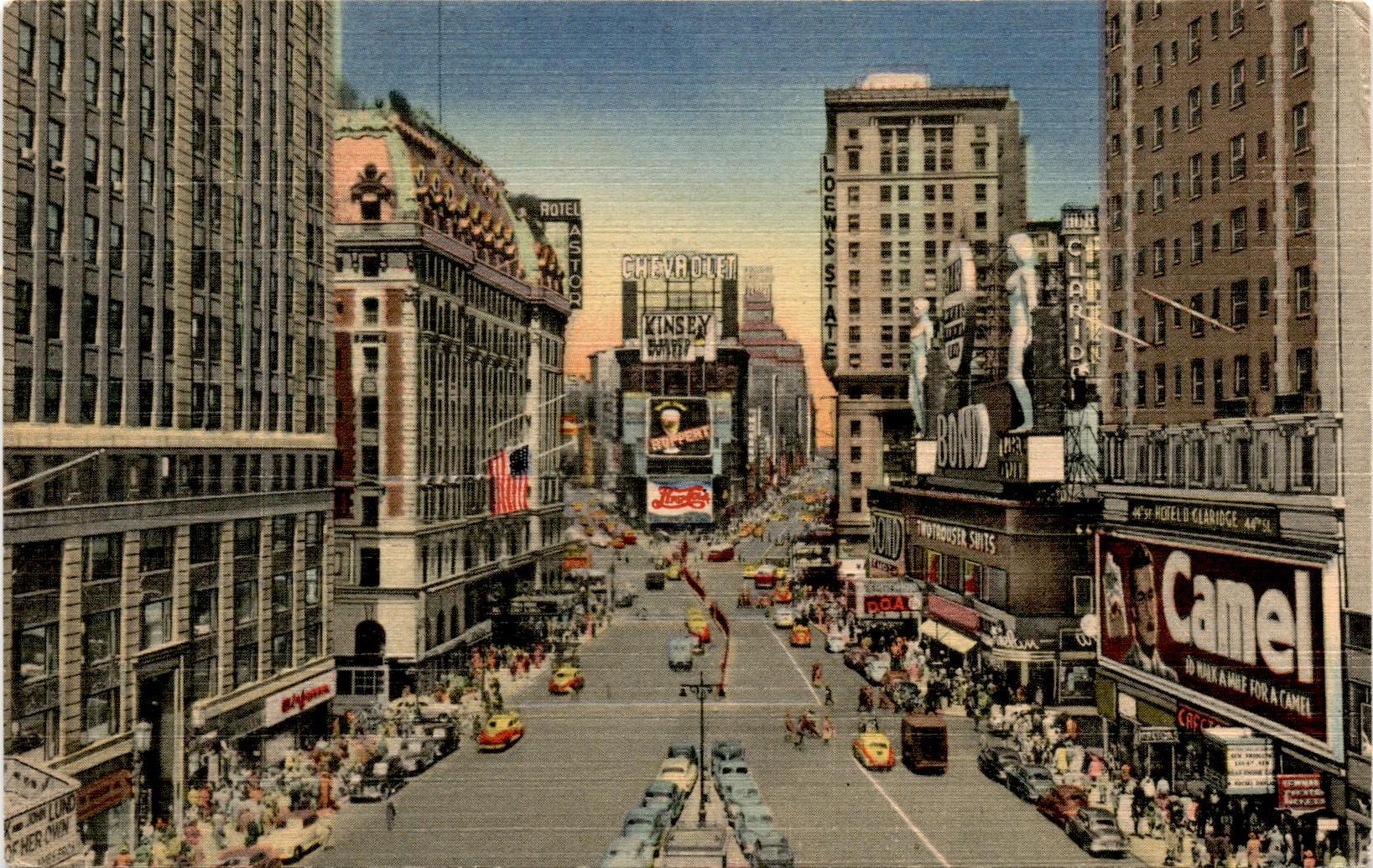 Overall, the postcard captures the essence of Times Square in the 1930s, with its vibrant energy and bustling activity. It serves as a reminder of the rich history and culture of this iconic location, as well as the patriotic spirit of the time. The mention of various names and locations adds to the nostalgia and charm of the postcard, making it a unique and interesting piece of memorabilia from a bygone era.