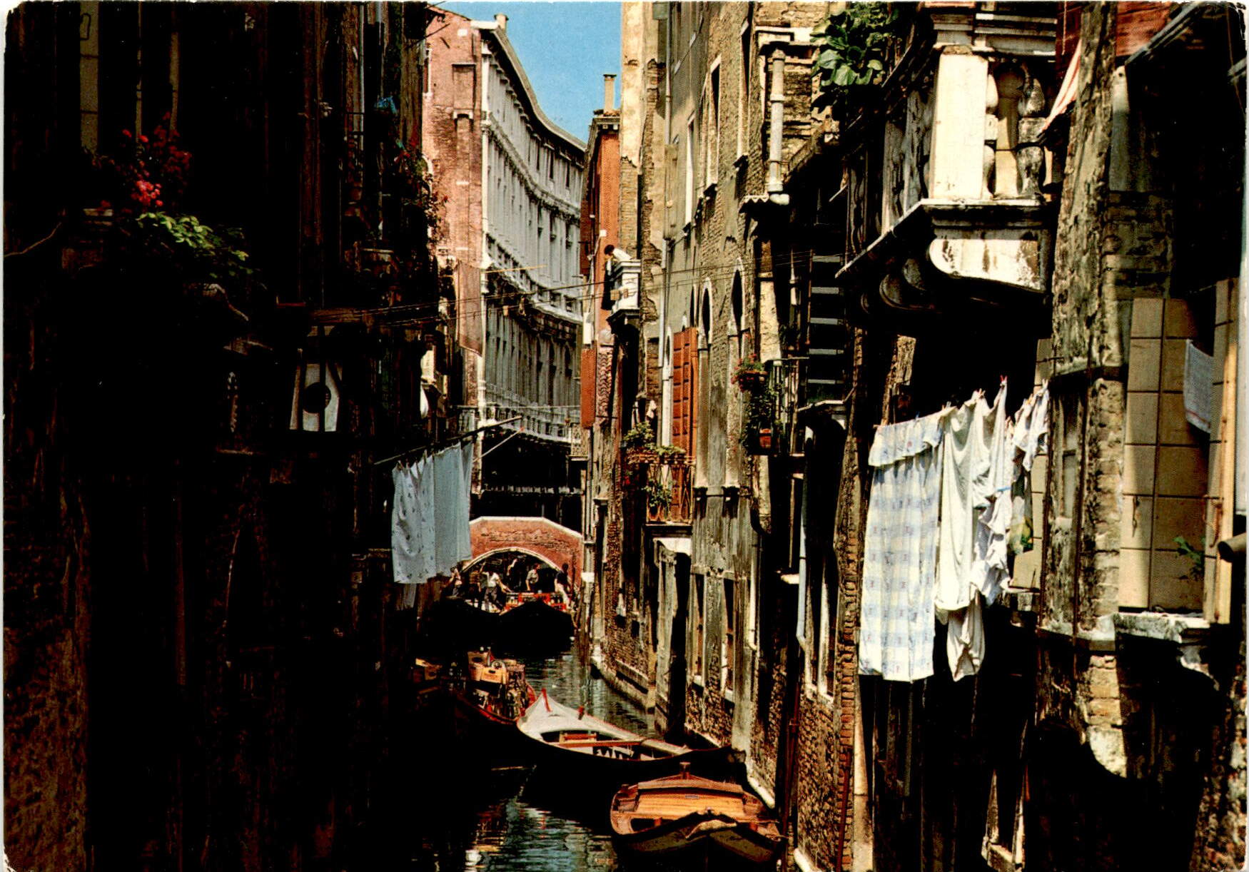 Back of PostcardThe postcard from Venice, specifically Rio Pesaro, captures the essence of the city with its unique charm and beauty. The writer describes spending their nights in Venice, with their room overlooking the picturesque Rio Pesaro. Despite the city’s dirtiness, they find it to be a magical place, especially when riding the iconic gondolas.