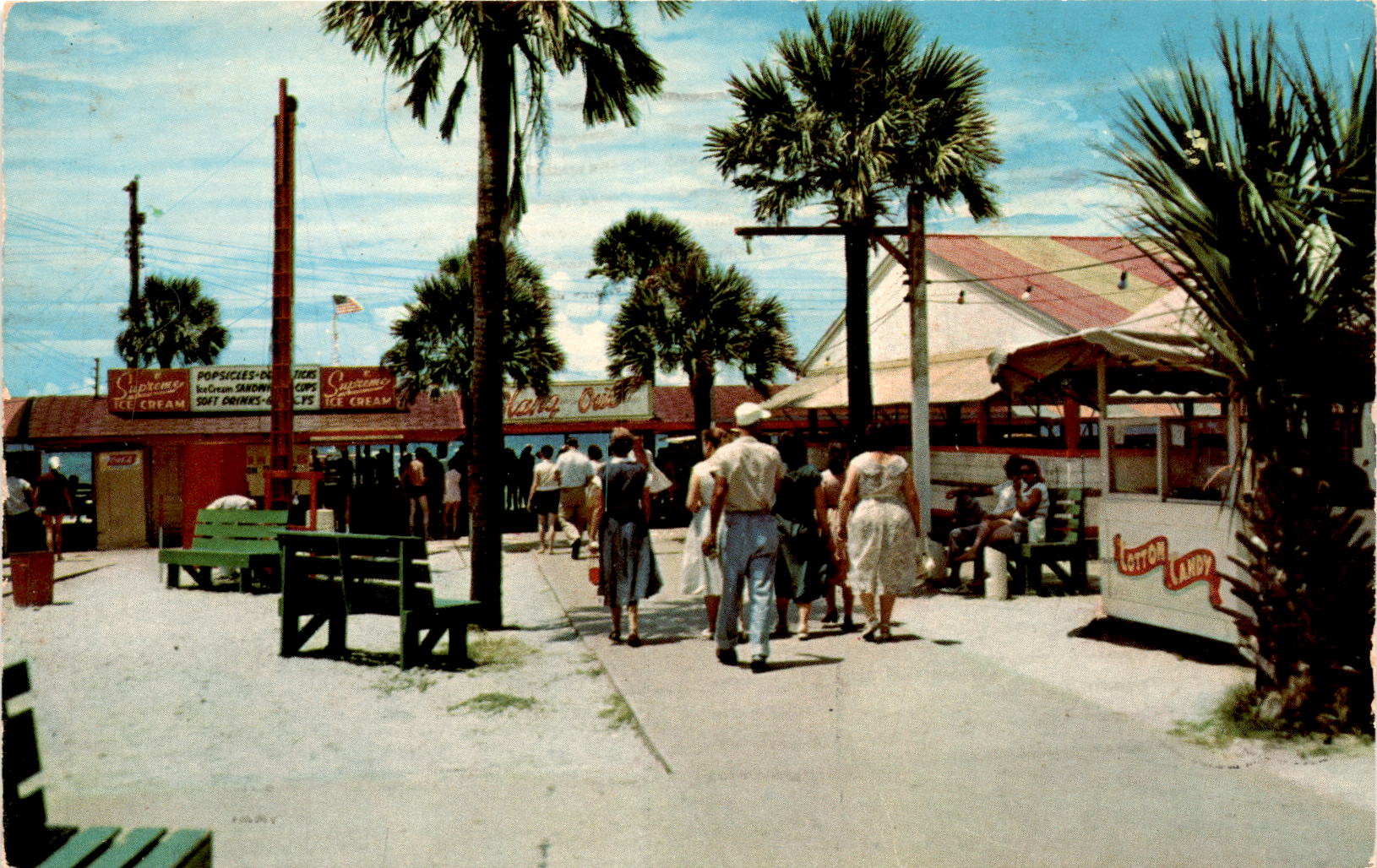 The postcard from 1958 depicts a fun day at the beach in Panama City, Florida. The front of the postcard features a colorful image of Supreme Popsicles, ice cream, and soft drinks, highlighting the refreshing treats available at the beach. The back of the postcard includes a handwritten message about a day spent at the beach with friends, enjoying the sun and sand.