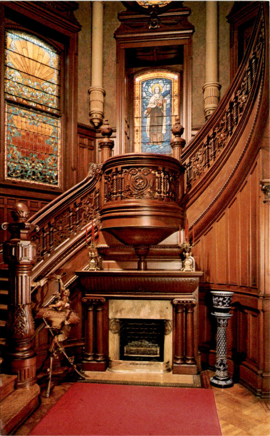 Located in Galveston, Texas, the Bishop’s Palace is a stunning architectural masterpiece that is open for public tours. The main staircase, handcrafted of oak, is a focal point of the entrance hallway and took three years to build with the help of 61 craftsmen. The Coat of Arms for the State of Texas is proudly displayed above the gas-burning fireplace, adding to the grandeur of the palace. Visitors can also admire the Gresham’s hand-carved calling card basket near the newel post.