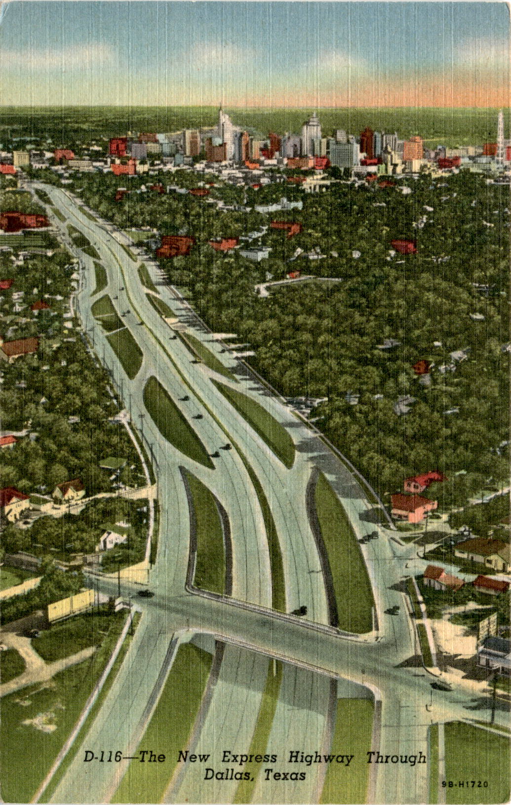 The front of the postcard features a photo of the new express highway through Dallas, Texas, taken by L. B. “Squire” Haskins. The image shows a modern and well-maintained highway, showcasing the city’s infrastructure and progress. The postcard is a genuine Curteich-Chicago “C.T. Art-Colortone” postcard, indicating its high quality and collectible value.