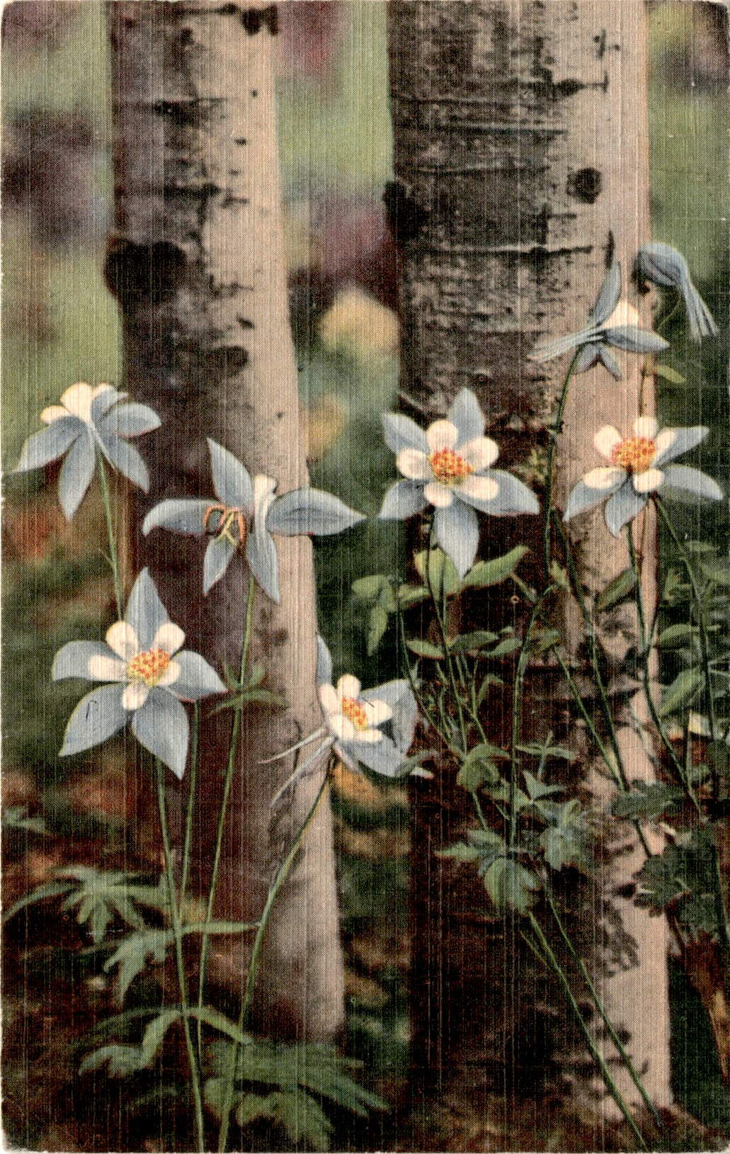 The postcard from Dennet Miss Sama showcases the beauty of the Colorado Columbines growing among the aspens. The Columbine, which is the state flower of Colorado, was chosen by school children and is one of the most unique wildflowers in the region. It is described as a delicate and exquisite flower that thrives in the timbered vales of the mountains.