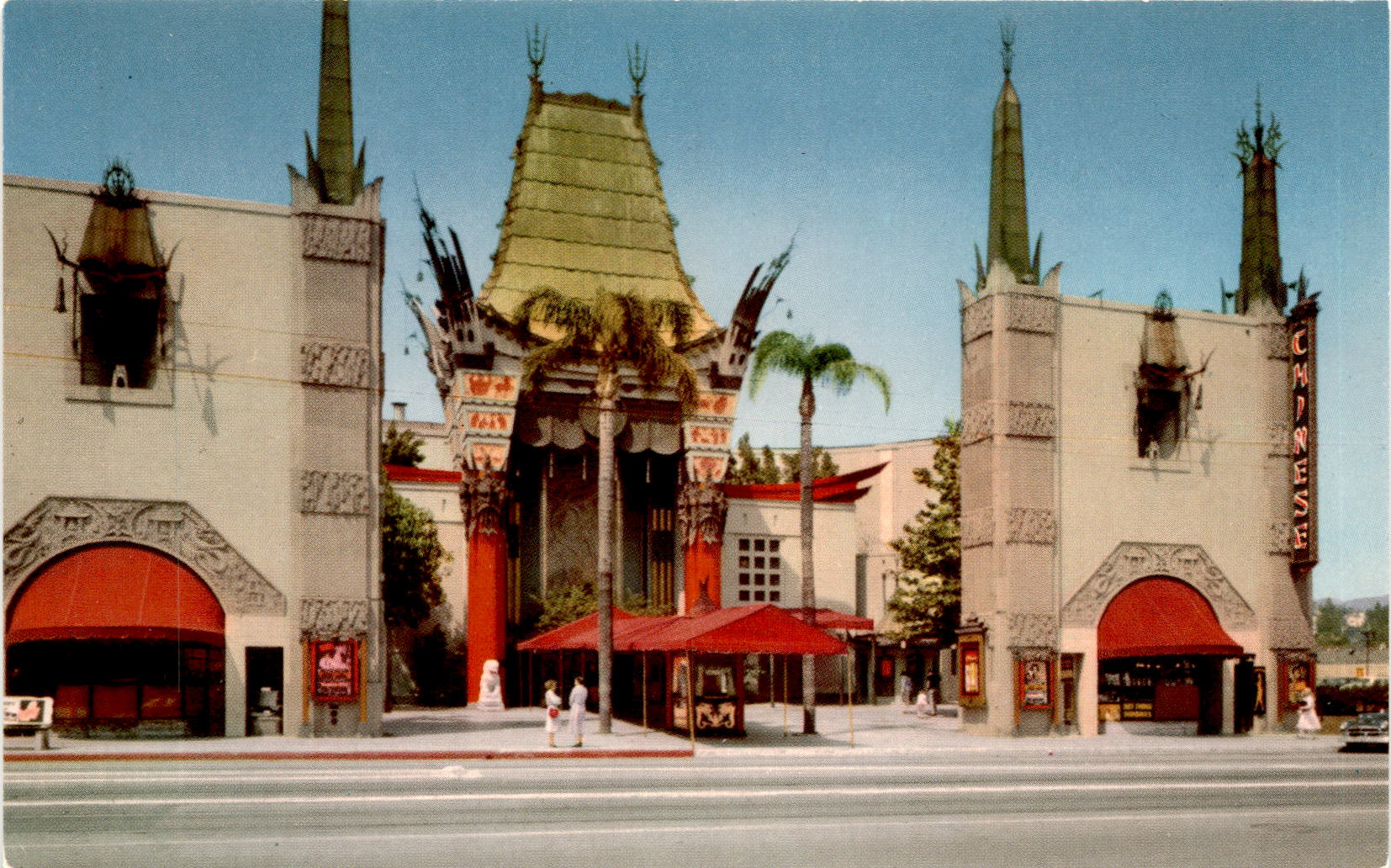 Back of PostcardThe Grauman’s Chinese Theatre in Hollywood, California is a must-see landmark on Hollywood Blvd. Known for hosting “super colossal” premieres, this unique theatre is a popular spot for movie buffs and tourists alike. The forecourt of the theatre is adorned with palm trees and features the hand and foot prints of famous stars, both past and present, immortalized in cement.
