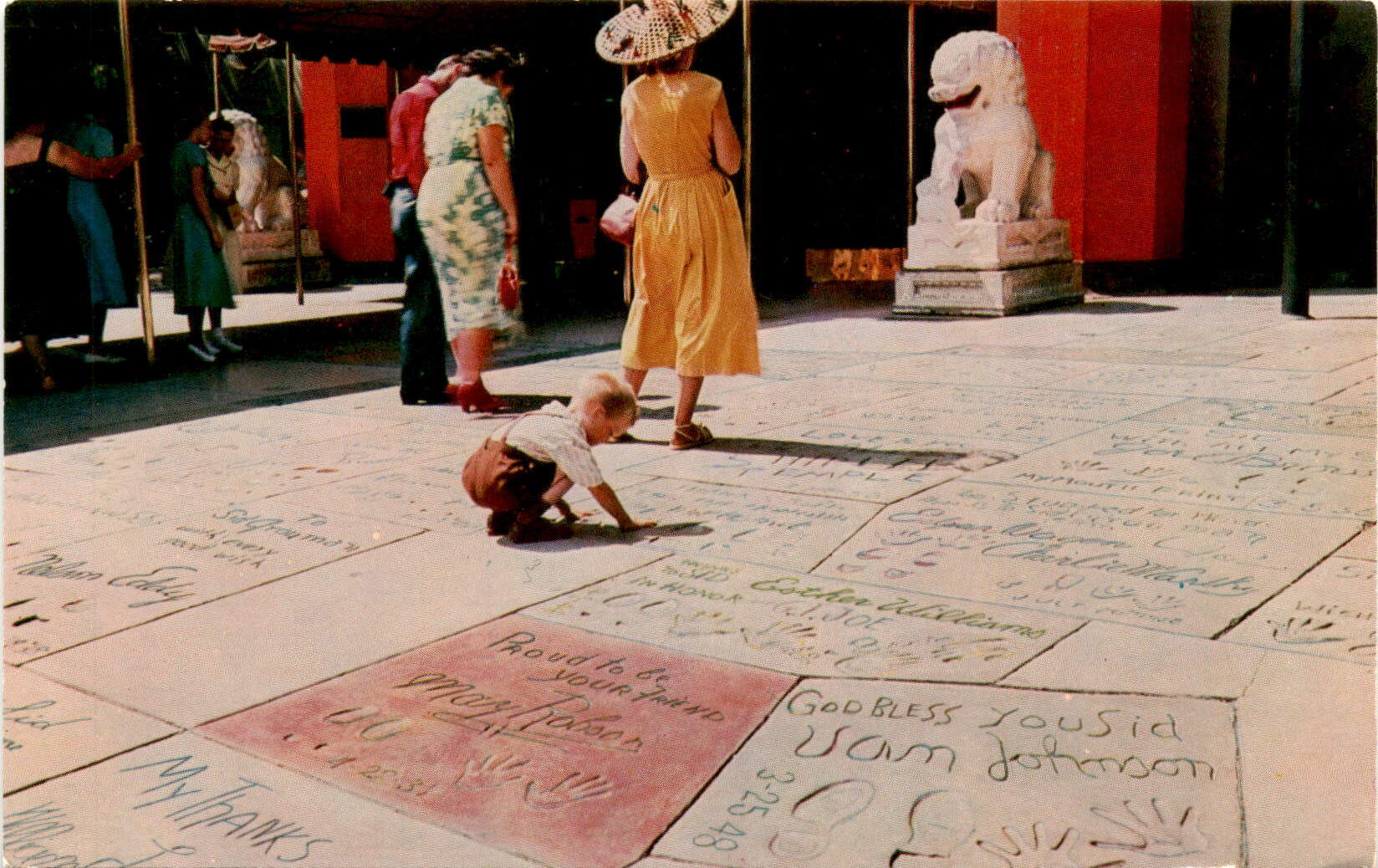 The postcard features a colorful image of Grauman’s Chinese Theatre in Hollywood, known for preserving the hand and footprints of famous movie stars in cement on the sidewalk entrance. Among the names mentioned on the postcard are Esther Williams, Jousia, and Van Johnson, with a message that reads “GOD BLESS” and “Roud to be YOUR TREND.” The postcard is a vibrant representation of the glamour and history of Hollywood’s entertainment industry.