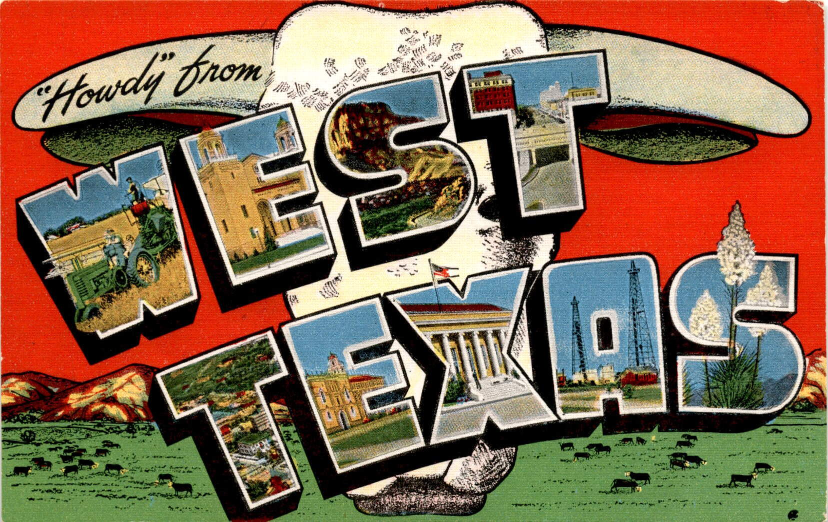 Greetings from the Key to Views on the other side of this postcard! The front of this postcard showcases various scenes from Texas, including modern harvesting time, the Municipal Auditorium in Big Spring, Guadalupe Peak on U.S. Highway 82, an underpass and Pine Street looking north, an aerial view of Pampa, the Administration Building at Texas Tech College in Lubbock, the U.S. Post Office in Sweetwater, a typical Texas oil field, and a yucca in bloom. Each image captures a different aspect of the diverse landscape and culture of Texas.