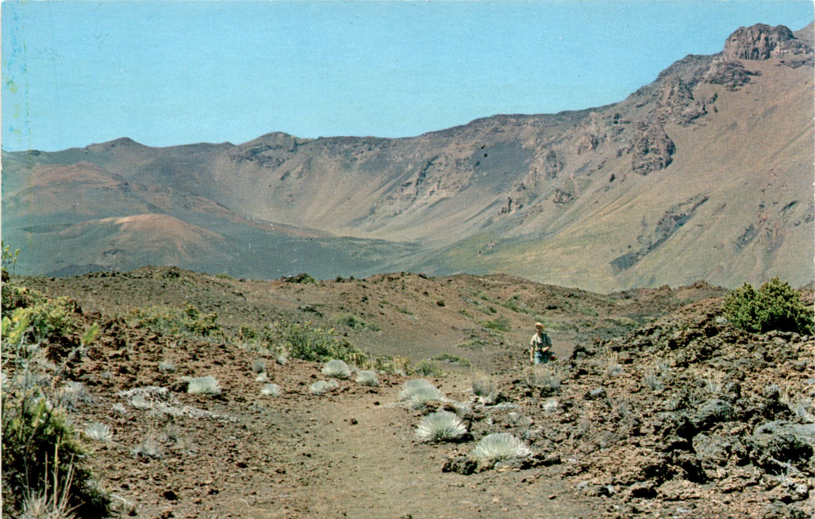 The front of this postcard showcases the stunning Haleakala Crater in Hawaii National Park, specifically highlighting the young Silverswords on the Silversword Loop Trail. These unique plants can grow up to 9 feet tall and bloom between May and October, adding a burst of color to the landscape.