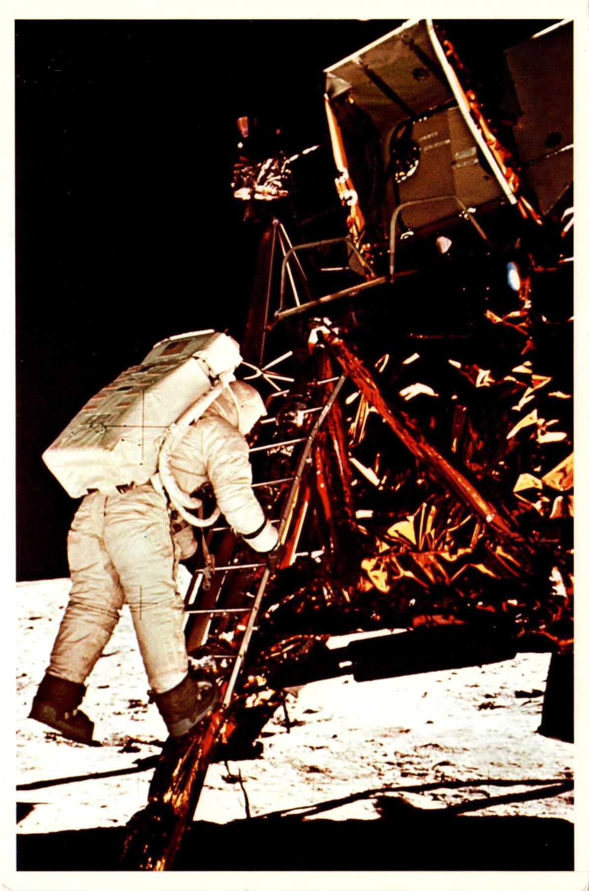 The front of the postcard depicts a historic moment in space exploration – Astronaut Edwin E. Aldrin Jr. descending the steps of the Lunar Module ladder as he prepares to walk on the Moon during the Apollo 11 mission. The photograph was taken by Astronaut Neil A. Armstrong with a 70mm lunar surface camera. This iconic image captures a significant milestone in human history.