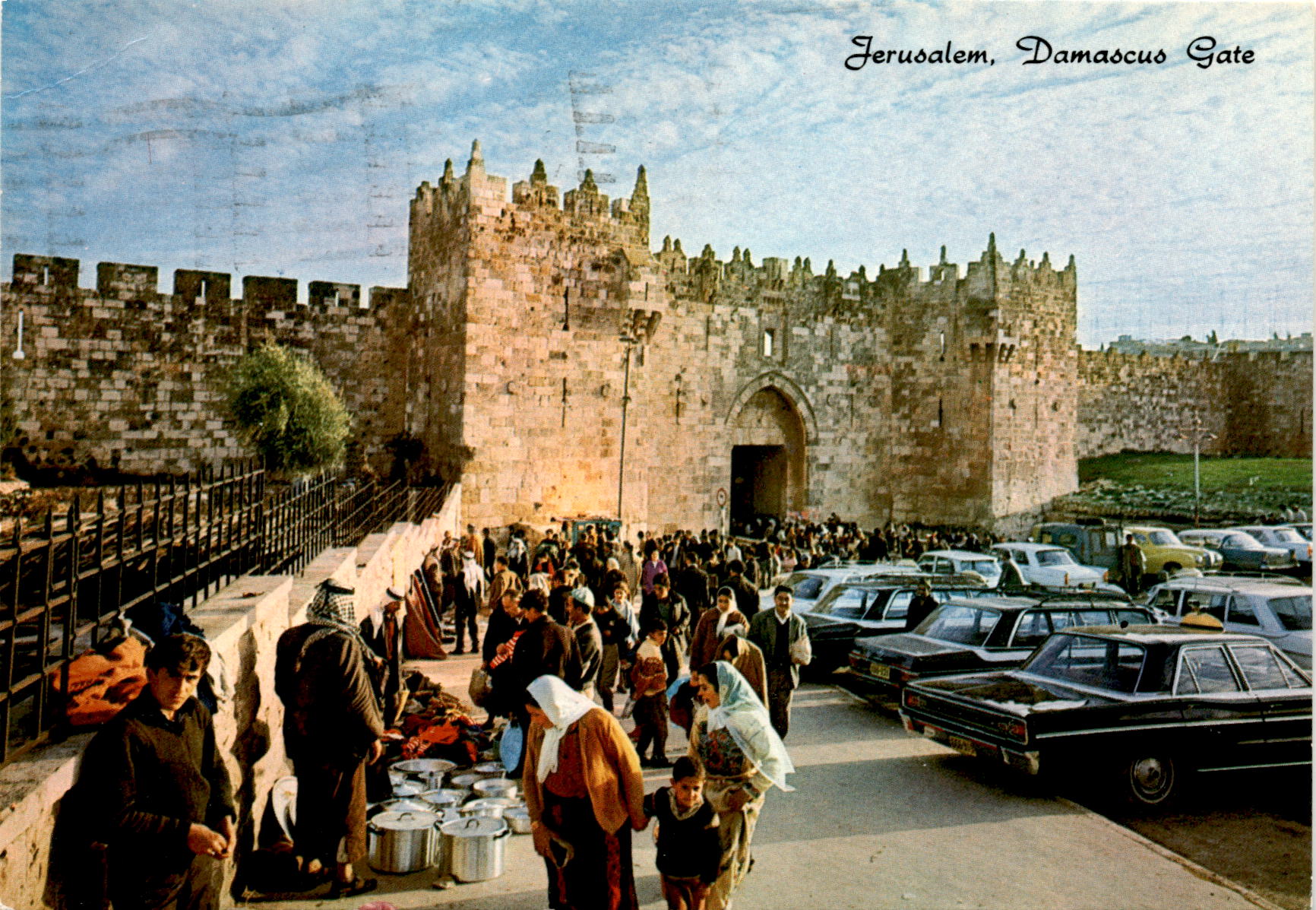 The front of the postcard showcases the ornate Damascus Gate, marking the beginning of the highway to Damascus. Referred to as Shaar Shechem by Jews, the gate is a significant landmark in Jerusalem. The back of the postcard includes greetings from the Holy Land and the sender’s details, indicating they are from Menard, Texas in the USA. The postcard is a snapshot of life in Jerusalem during the holiday season, with a mix of festive plans and health concerns.