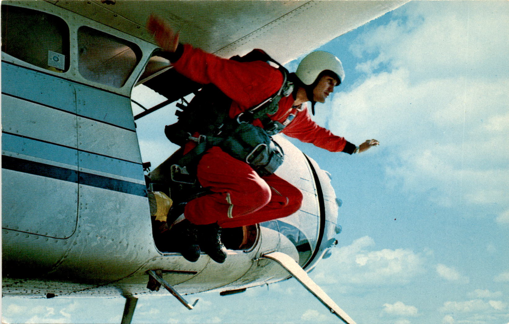 The front of this postcard captures a thrilling moment as Jim Davis jumps out of a Cessna at 7000 feet and free falls to 1000 feet before landing directly in front of the audience at Tommy Bartlett’s Water Ski Show in Wisconsin Dells. The photo, taken by John A. Trumble, perfectly captures the excitement and adrenaline of this daring stunt. The show takes place daily at 1:00, 5:00, and 8:30 p.m. on Lake Delton, offering visitors a chance to witness incredible feats like this one.