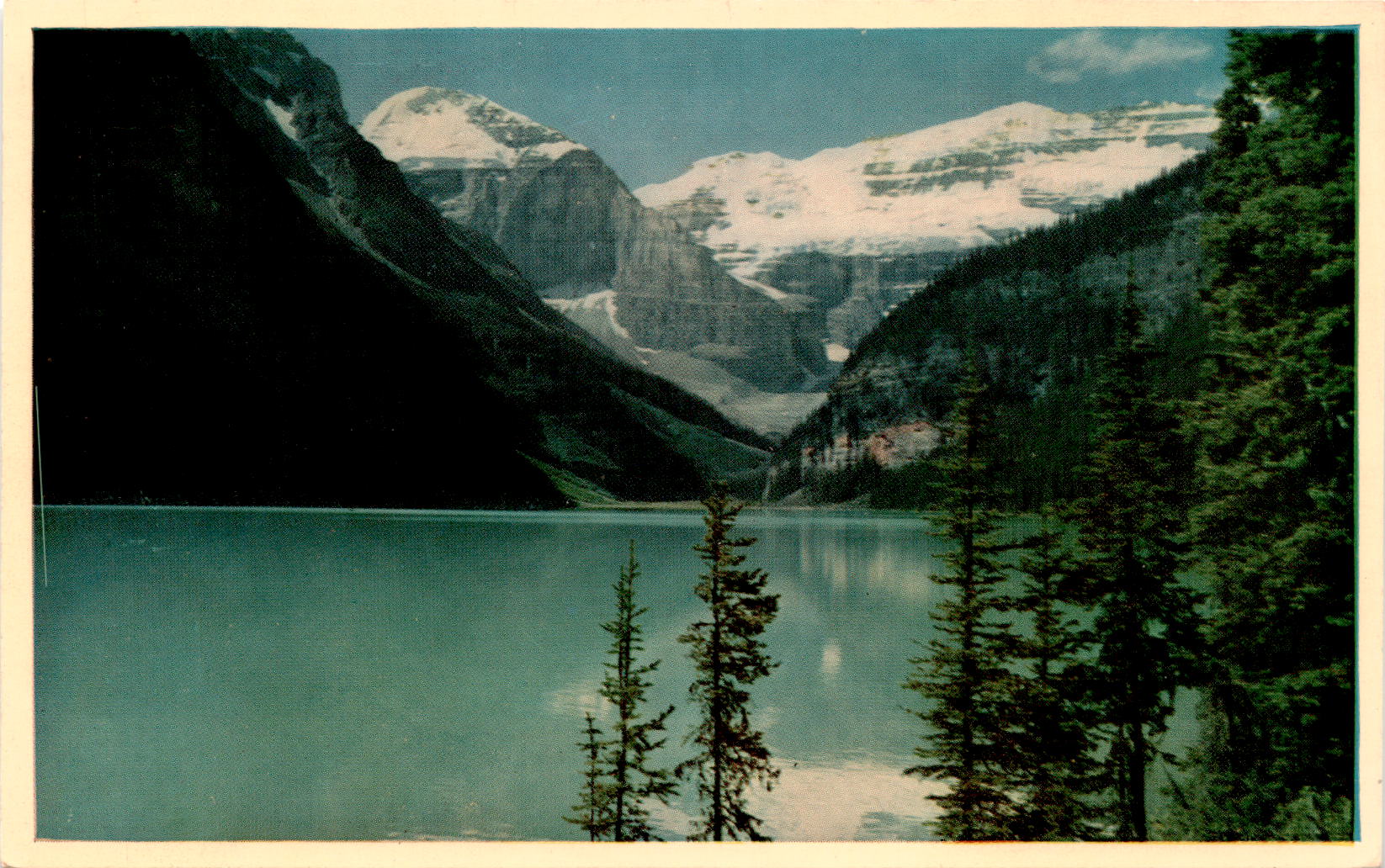 Overall, the postcard captures the essence of the Canadian Rockies and the beauty of Lake Louise in a single image. The combination of the glacier-capped mountains and the serene lake creates a scene that is both awe-inspiring and peaceful. Whether purchased as a memento or sent to a friend, this postcard is sure to evoke a sense of wonder and appreciation for the natural world.