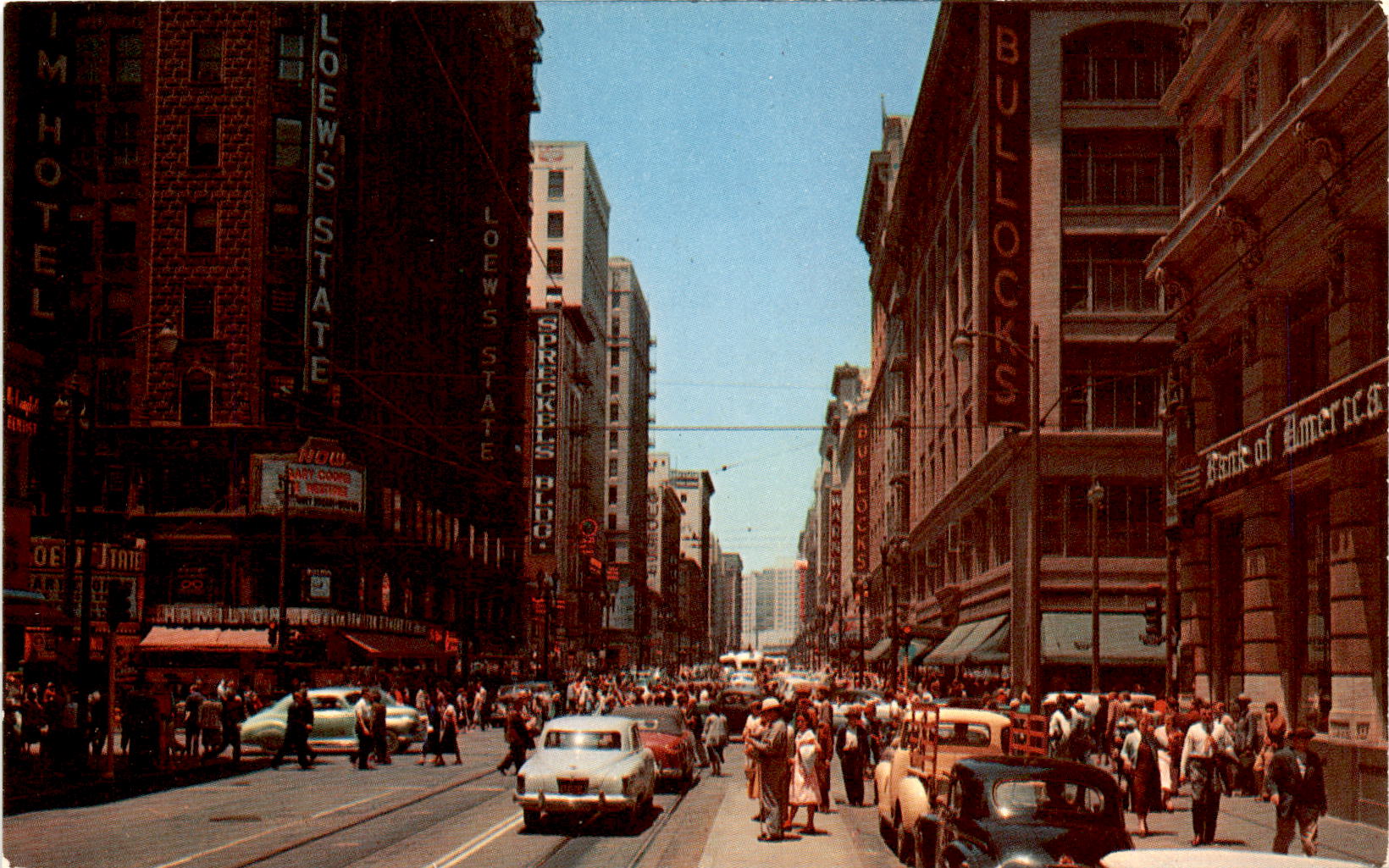 The front of the postcard features a vibrant image of the bustling city of Los Angeles, with the iconic Bank of America building at Seventh and Broadway taking center stage. The image captures the heartbeat of a busy metropolis, showcasing the energy and vibrancy of the city. The color scheme, created by artist Frank Thomas, adds to the dynamic feel of the scene.