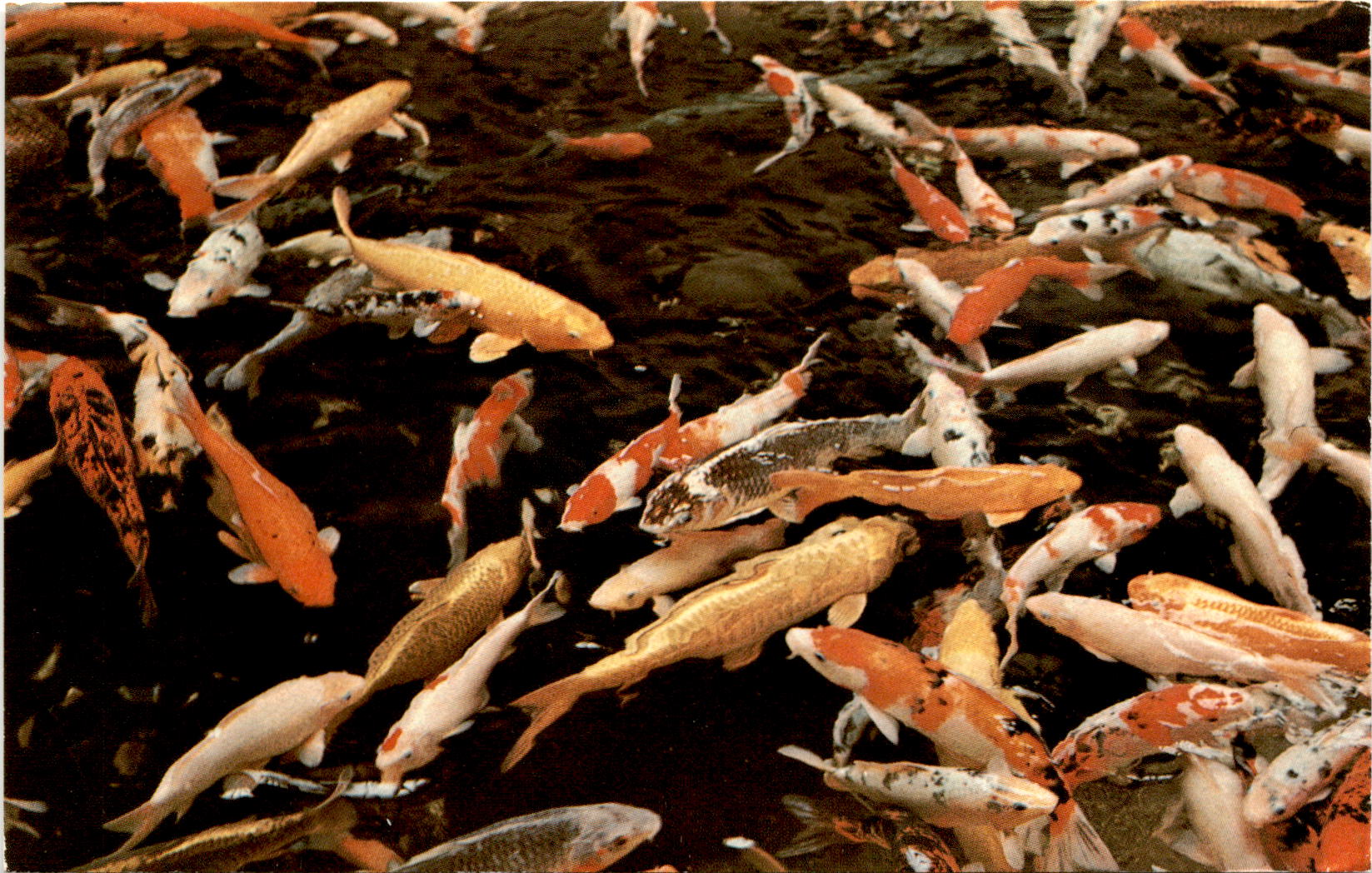 The front of the postcard features a photograph by Loye Guthrie showcasing colorful carp found in fishponds throughout Hawaii. These vibrant fish, known for their many hues, can live for fifty years or more. The back of the postcard includes a message from Norton and Louise, who are having a wonderful time in Hawaii and plan to leave for Maui the next day.