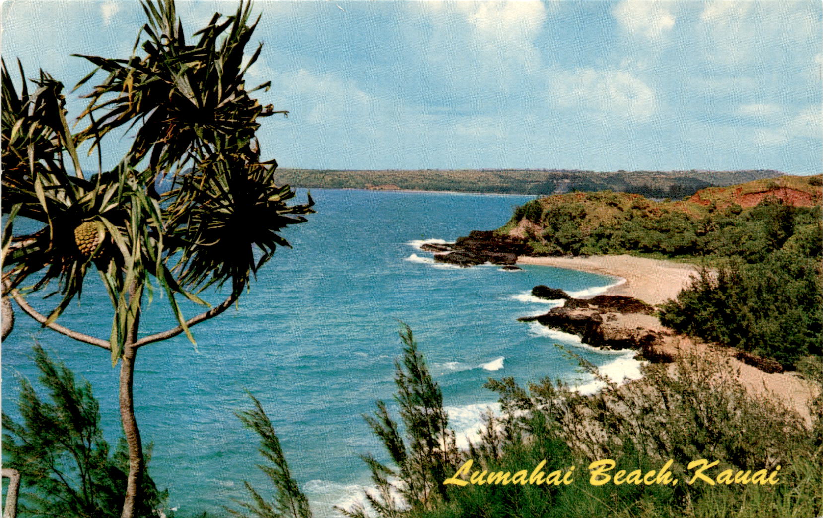 The postcard showcases the natural beauty of Lumahai Beach, inviting viewers to imagine themselves relaxing on its shores and enjoying the peaceful sound of the waves. The image captures the essence of a tropical paradise, with palm trees swaying in the breeze and the clear blue sky overhead. It is a reminder of the beauty and tranquility that can be found in nature.
