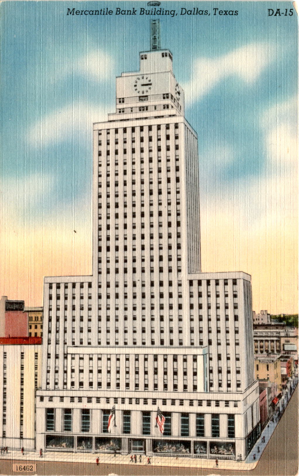The front of the postcard features a black and white image of the Mercantile Bank Building in Dallas, Texas. The postcard is a “Colourpicture” publication from Boston, Massachusetts and is sold by the Martin News Agency in Dallas. The back of the postcard has space for writing messages and includes instructions for placing a stamp.