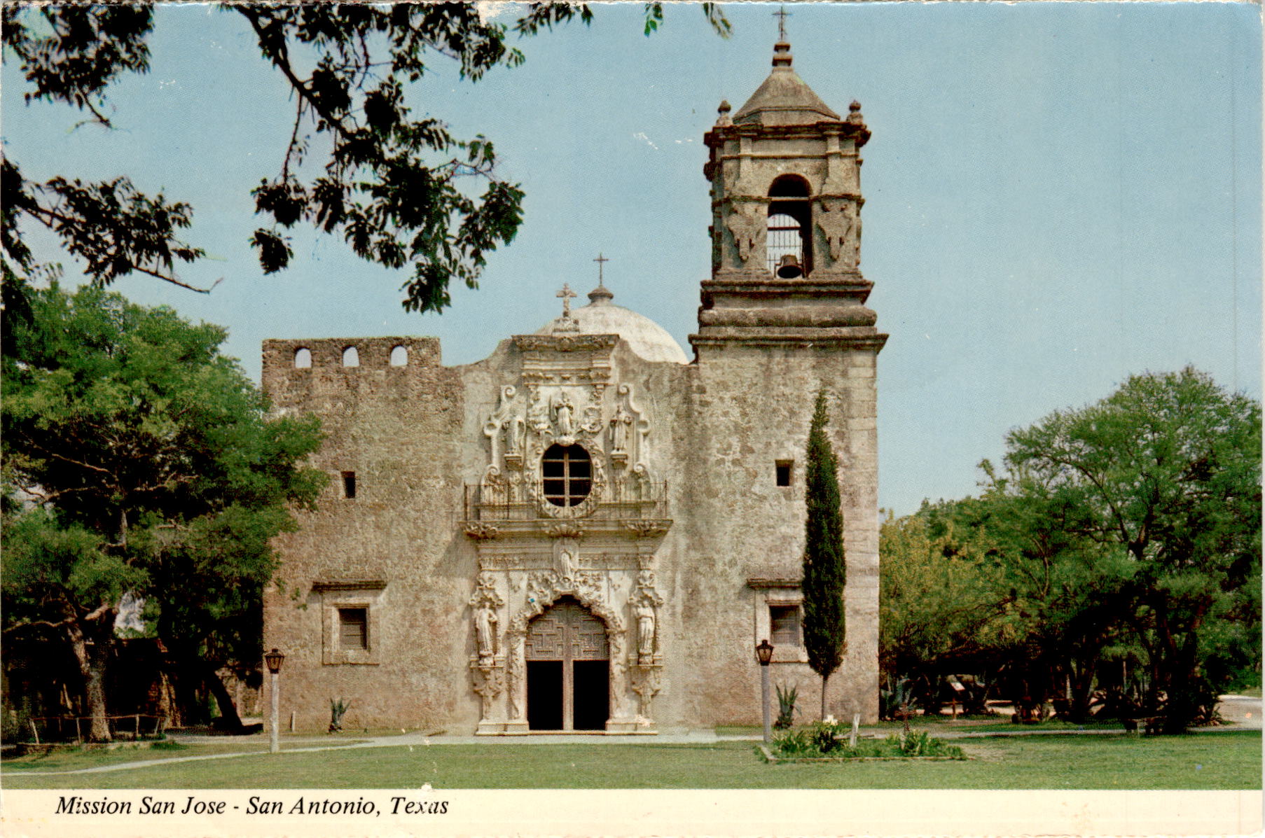 The front of the postcard features a stunning image of Mission San Jose in San Antonio, Texas. The intricate facade above the entrance to the chapel is highlighted, showcasing the impressive carving that took Pedro Huizar 13 years to complete. The postcard is a snapshot of the rich history and craftsmanship that can be found at this historic site.