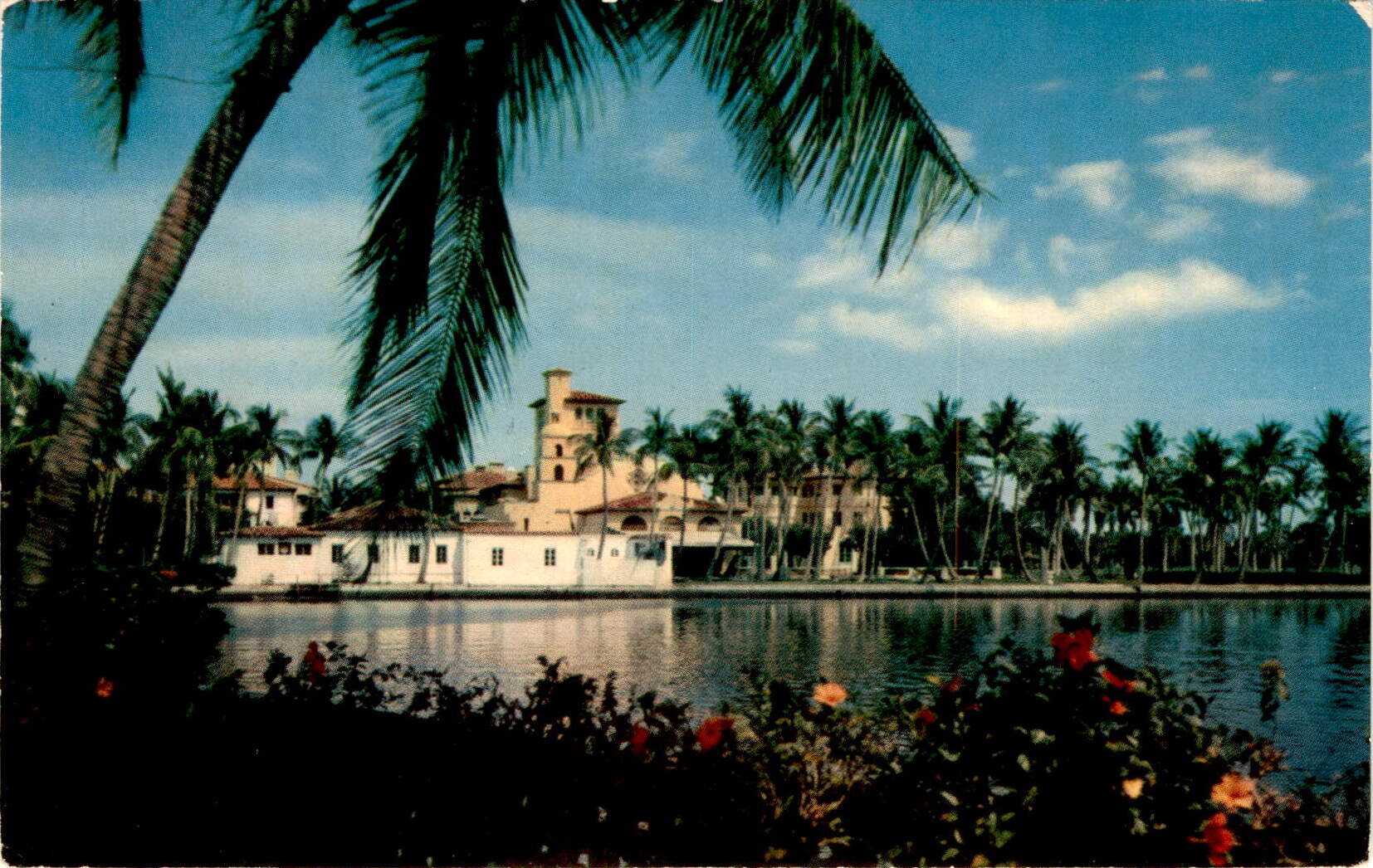 This postcard from Palm Beach, Florida showcases a stunning view across Lake Worth to the exclusive Everglades Club. The scene is framed by colorful hibiscus and coconut palms, creating a picturesque setting. The vibrant colors of the landscape are captured in the photo, highlighting the natural beauty of the area.