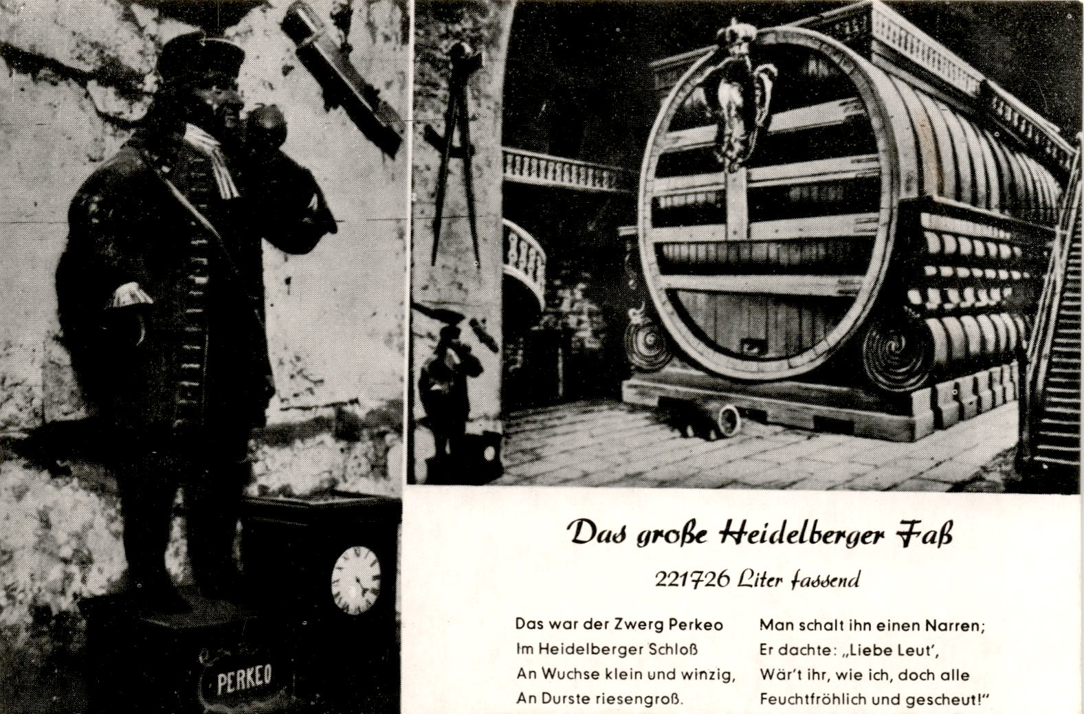 Back of PostcardThe front of the postcard features a poem about Perkeo, a dwarf who lived in Heidelberg Castle and was known for his love of wine. Despite his small stature, Perkeo had a huge thirst for wine and was often called a fool for his antics. The poem invites readers to come and see the Old Heidelberg Cake Shop Restaurant Party House in San Antonio, Texas, where they can experience the same quality and fun-loving spirit as Perkeo.