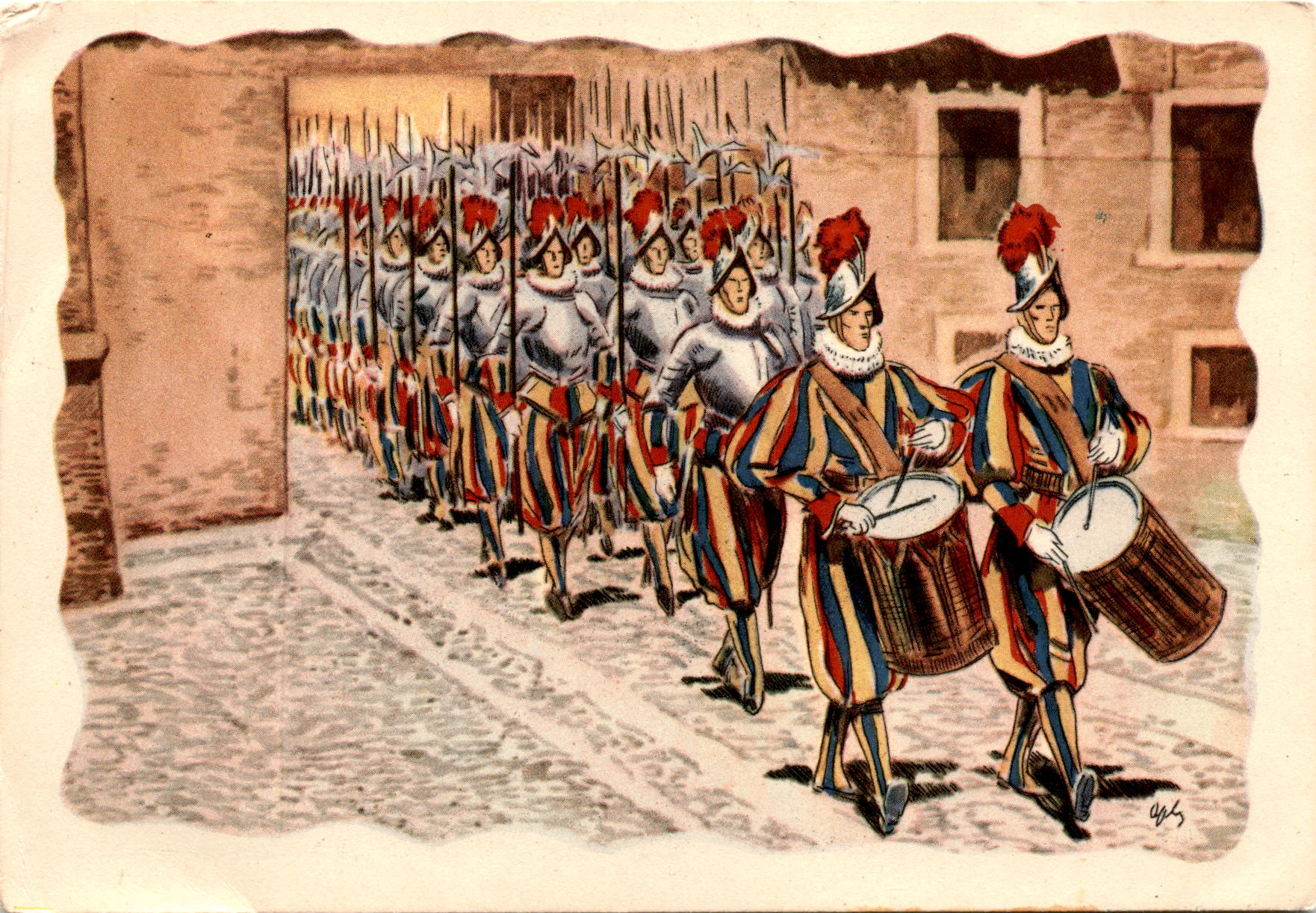 The Pontifical Armed Forces, also known as the Swiss Guard, have a long-standing history of service to the Vatican City. The postcard highlights the importance of this military force in protecting the Pope and the Vatican, showcasing their ceremonial march through the city. The Swiss Guard is a symbol of tradition and loyalty, representing the strong connection between the Catholic Church and the military.