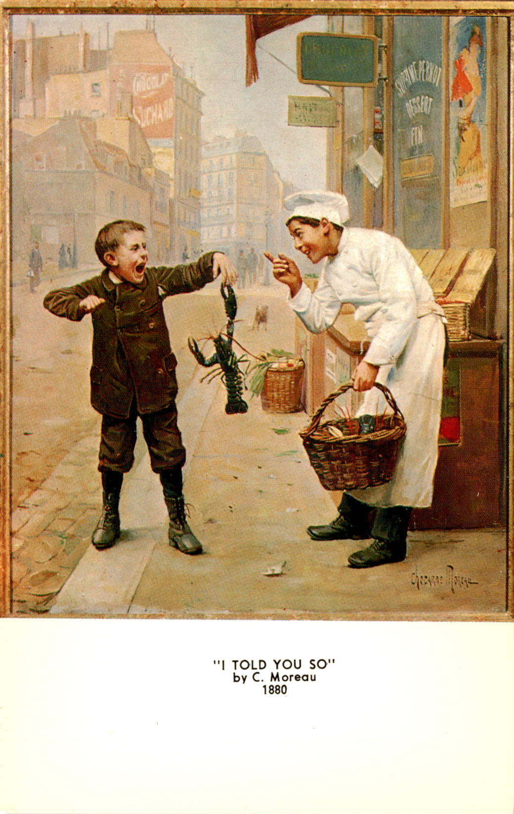 The postcard features a painting titled “I TOLD YOU SO” by C. Moreau from 1880, part of the Suchard collection. The dessert depicted in the painting is now in the collection of Haussner’s Restaurant, Inc. in Baltimore, Maryland. Known for their masterpieces in both art and dining, Haussner’s is a must-visit destination for those looking to experience a unique blend of culture and cuisine.