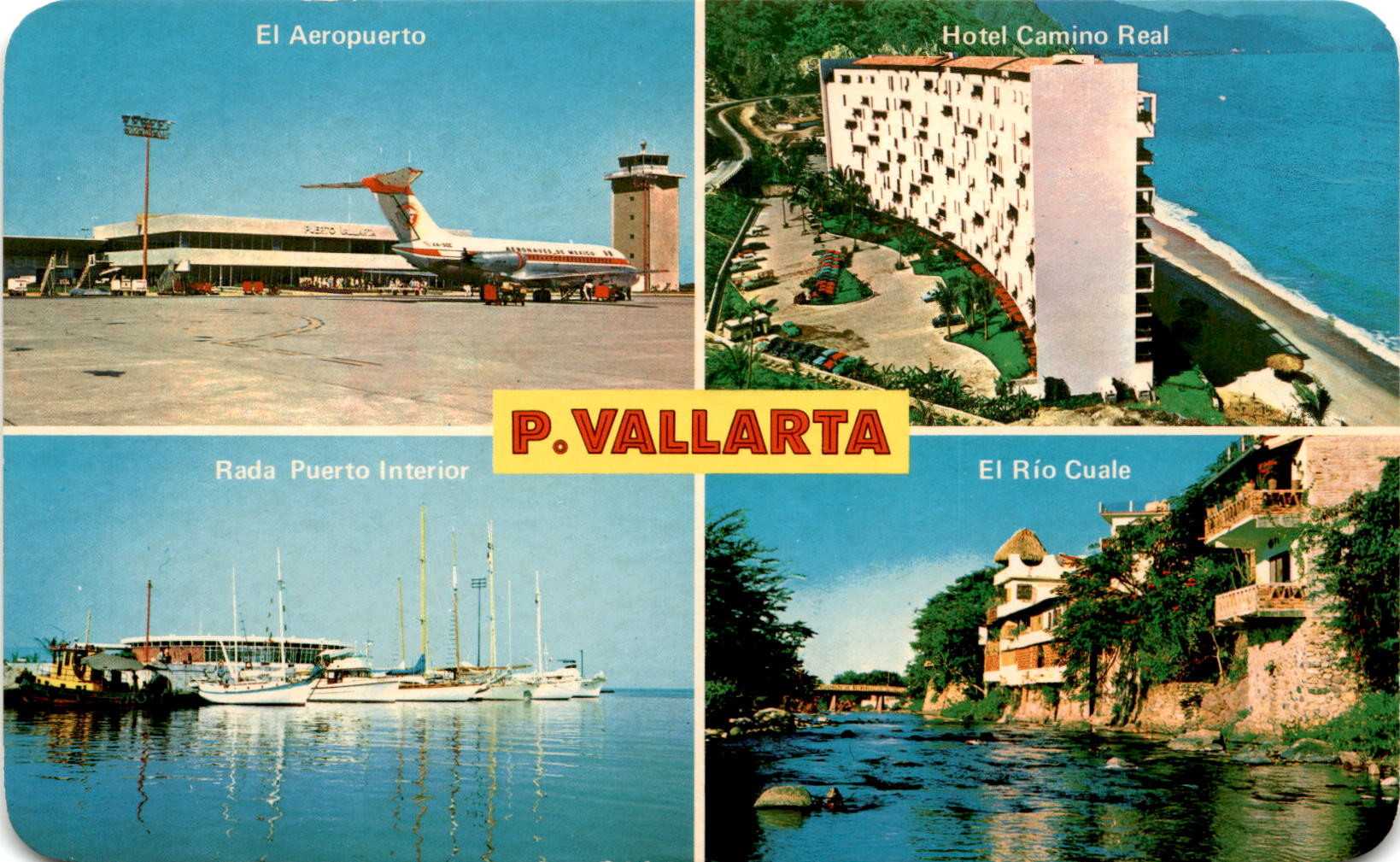 Puerto Vallarta, located on the Pacific coast of Mexico, is a popular tourist destination known for its beautiful beaches and vibrant culture. The front of this postcard showcases four distinct aspects of the city: the airport, Camino Real Hotel, Interior Port, and “Gringo Gulch.” Each of these locations offers a unique glimpse into the charm and beauty of Puerto Vallarta.