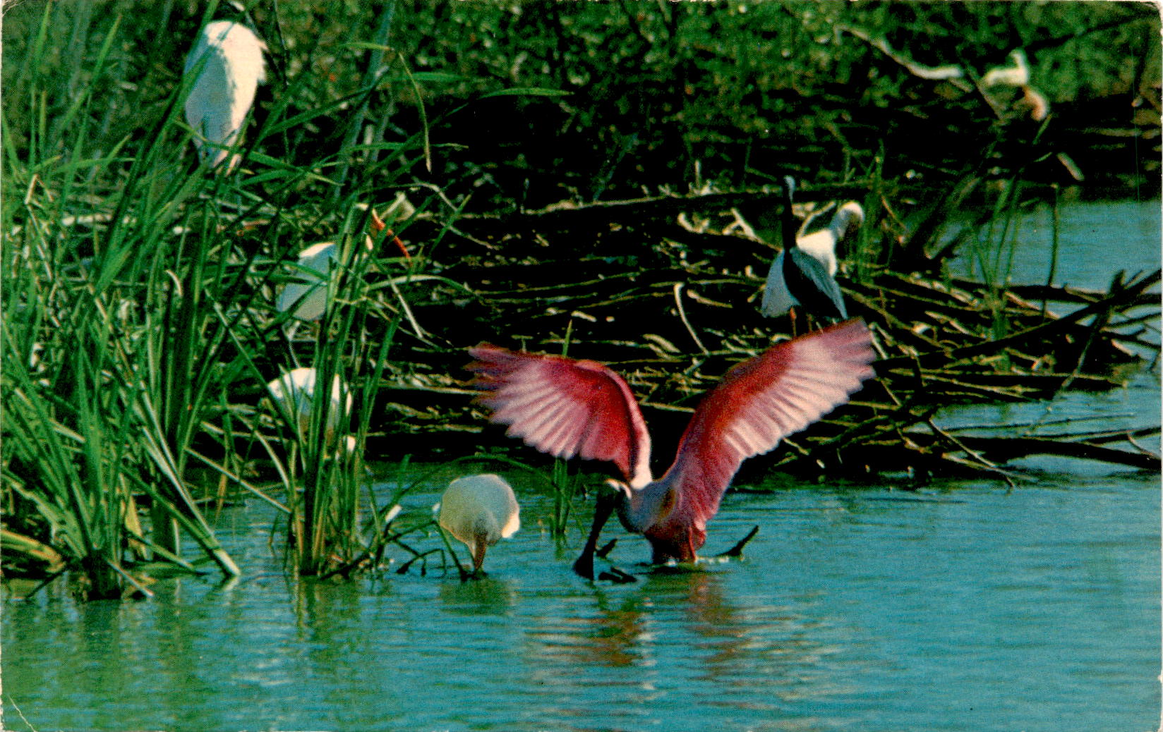 The postcard features a beautiful image of a Roseate Spoonbill feeding with other birds in the Florida Everglades. The sender, DJ M., is located in Naples, Florida, and the postcard is addressed to 58 Burning Tree Drive. The front of the postcard also includes the message “PEOPLE’S RIGHT TO PETITION FOR REDRESS” and references a company.