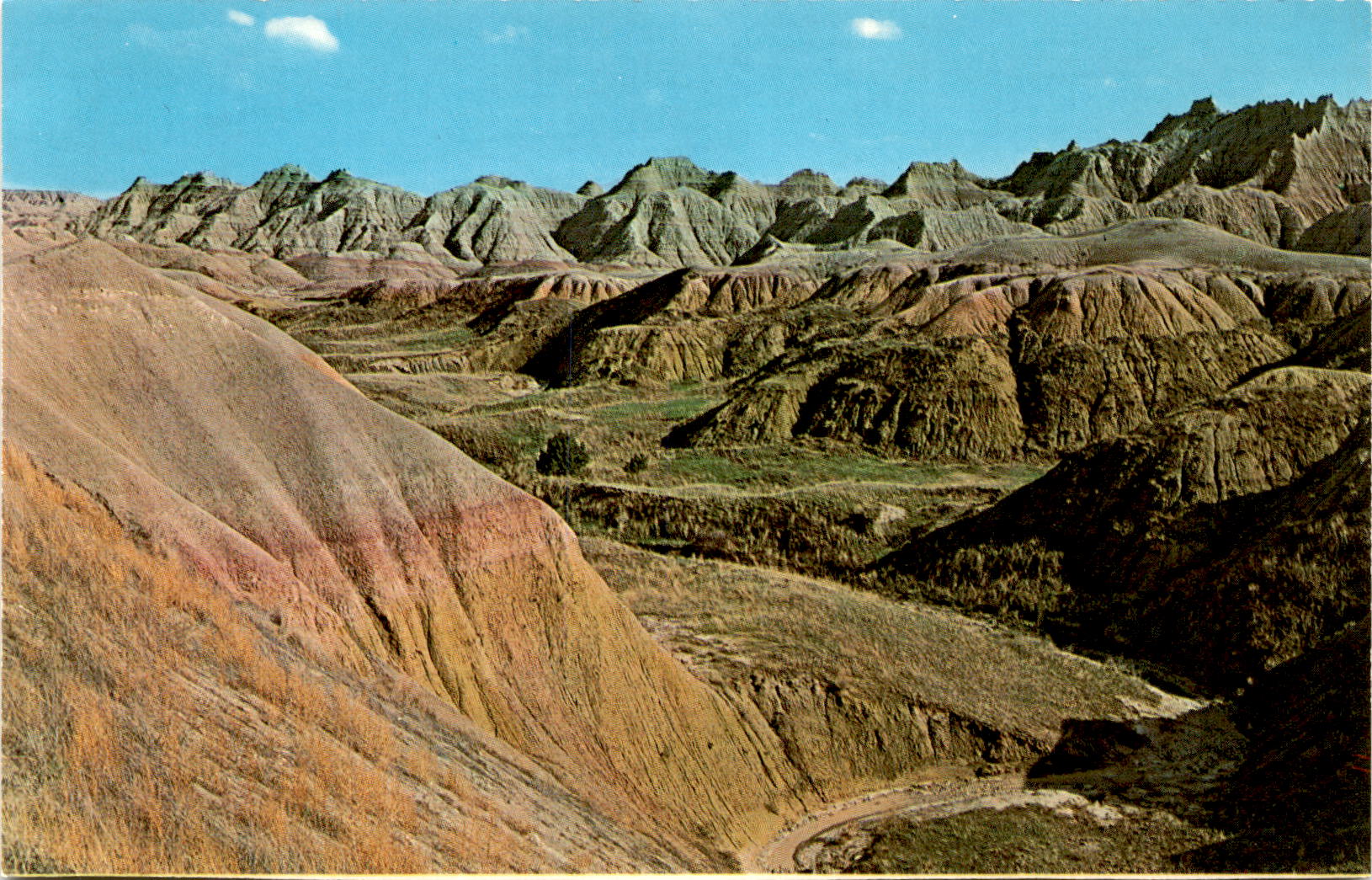 Back of PostcardThe front of this postcard showcases the stark contrast between the lush green grass and the barren outcroppings of the South Dakota Badlands. The landscape, once an ancient sea floor teeming with aquatic life and prehistoric beasts, is now a desolate yet beautiful sight that is constantly changing with infrequent rains. The image captures the essence of the region’s rich history and natural beauty.