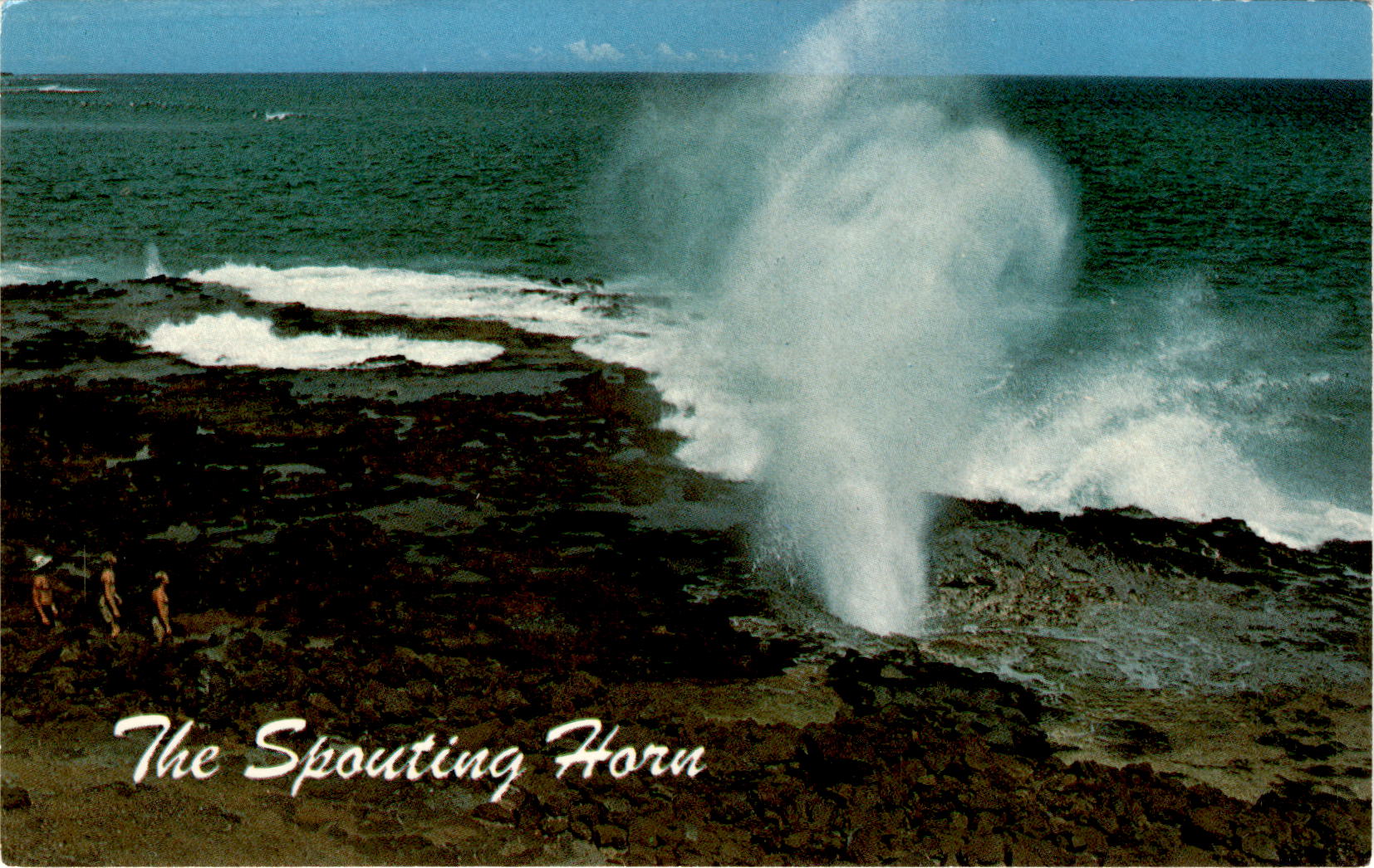 Back of PostcardThe Spouting Horn in Kauai, Hawaii is a natural wonder that is not only visually stunning but also audibly impressive. Unlike Oahu’s Blow Hole, the Spouting Horn is known for the sound it makes as well as the sight of the salt water geyser. The name “Spouting Horn” perfectly captures the essence of this beautiful natural phenomenon.