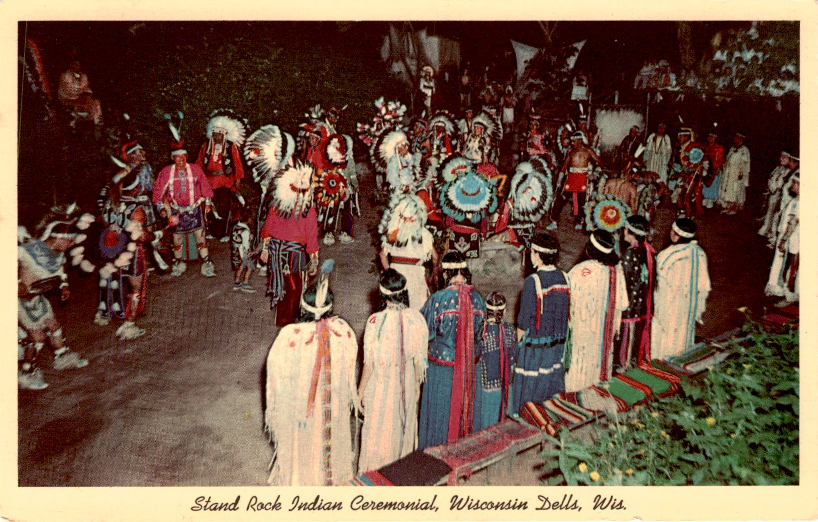 The Stand Rock Indian Ceremonial in Wisconsin Dells, Wisconsin is a vibrant and cultural event where both braves and squaws come together to participate in traditional dances. This postcard captures a moment of unity and celebration within the Native American community. The event showcases the rich history and traditions of the indigenous people in the area.
