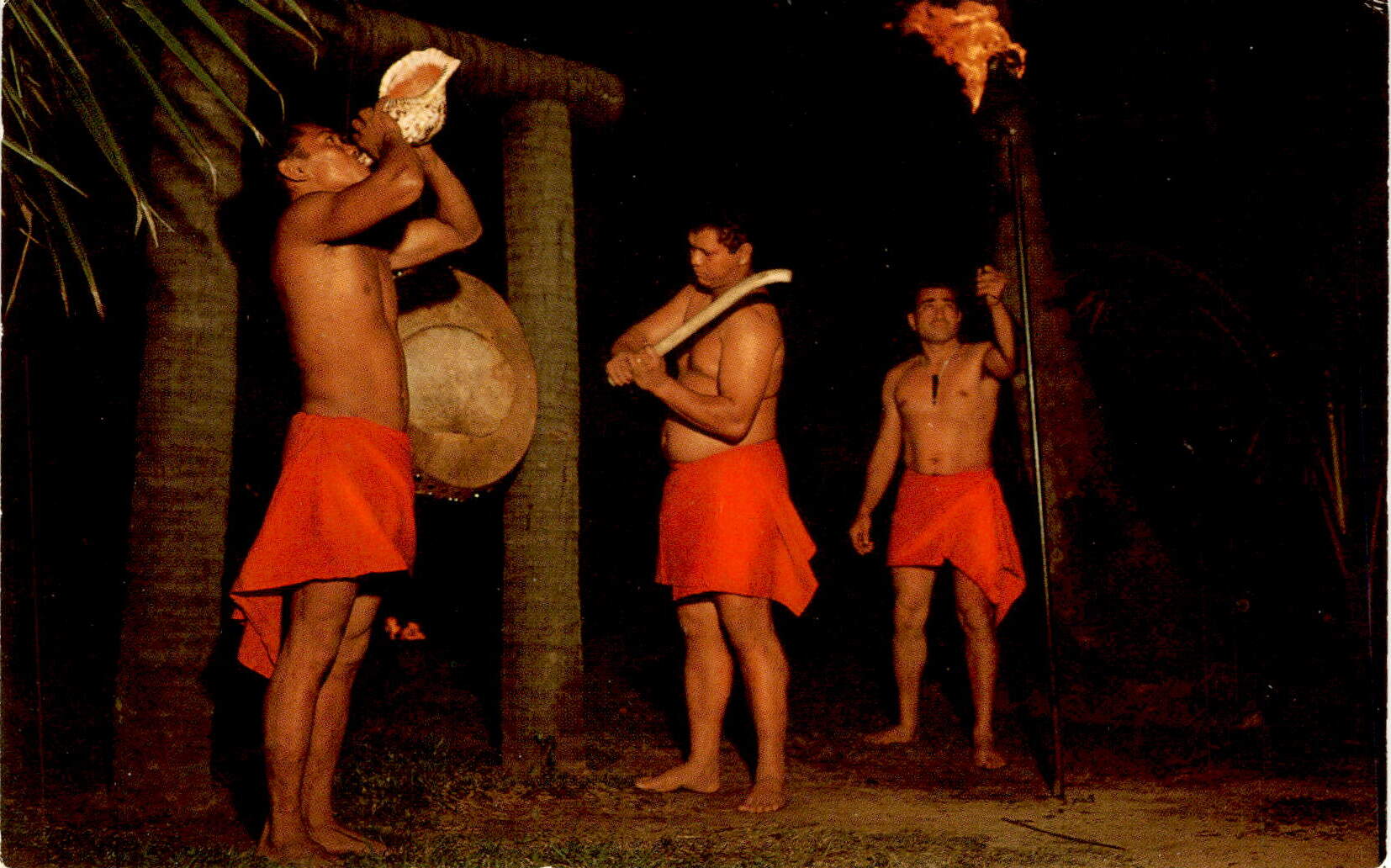 Overall, the postcard serves as a visual representation of the torch lighting ceremony in Hawaii, showcasing the natural beauty and cultural significance of the event. It transports the viewer to a place of tranquility and tradition, where the sound of the conch shell and the glow of the luau torches create a magical atmosphere. The postcard is a reminder of the unique experiences and traditions that Hawaii has to offer, inviting the recipient to immerse themselves in the beauty of the islands.