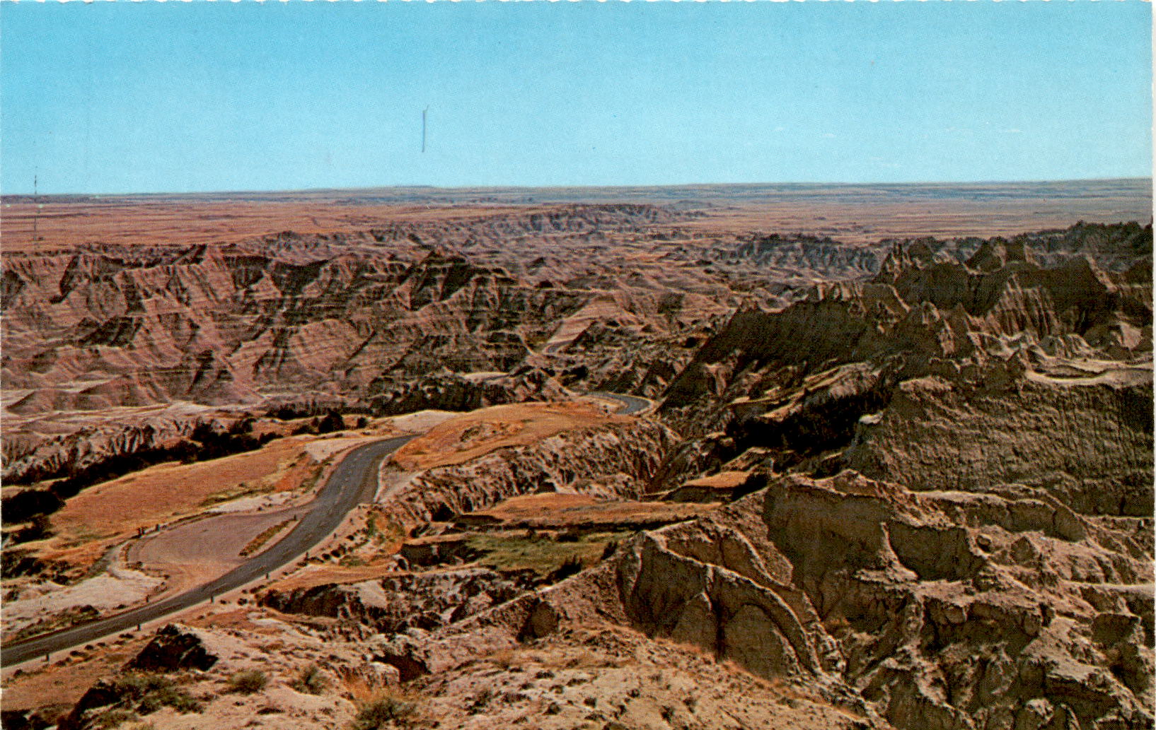 Overall, this postcard offers a glimpse into the captivating beauty of the Badlands National Monument and the scenic highway that runs through it. The image captures the essence of this iconic destination, drawing viewers in with its natural splendor. Whether sent as a souvenir or kept as a memento, this postcard serves as a reminder of the awe-inspiring landscapes found in the Badlands and the adventures that await those who explore its ancient terrain.