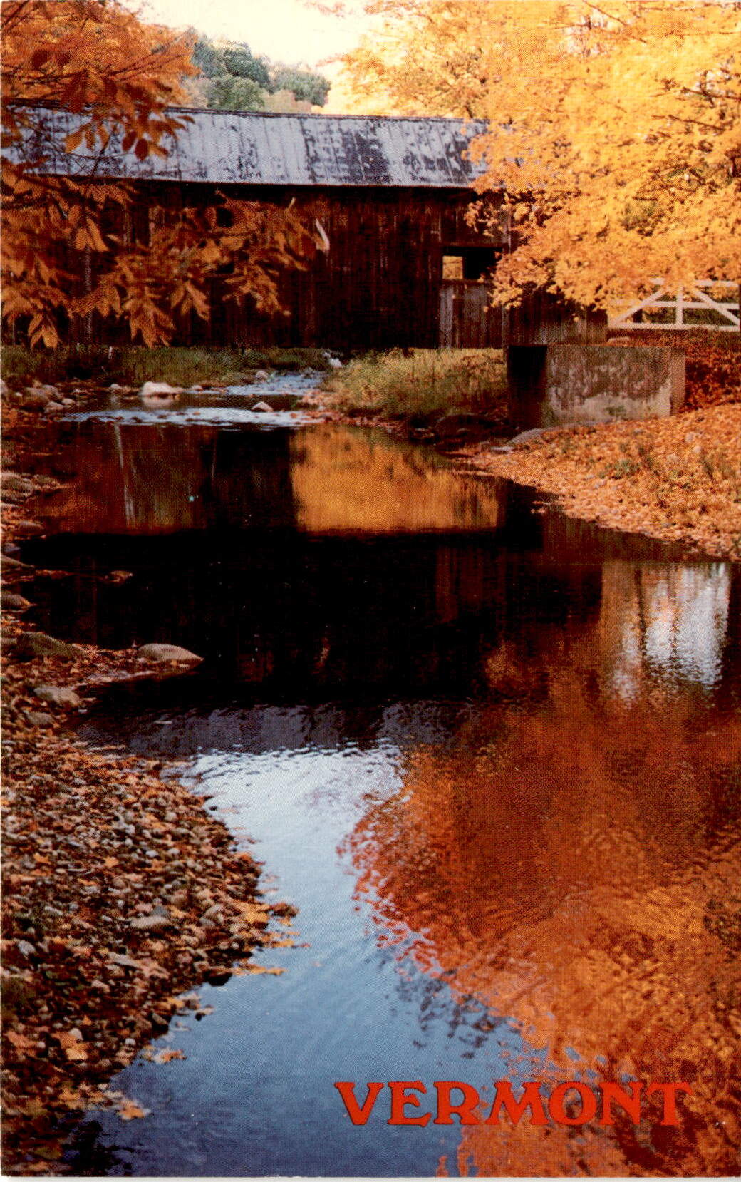 Vermont is known for its stunning autumn scenery, and the H-533 postcard captures this beauty perfectly. The image on the front shows a covered bridge and the brilliant gold of autumn reflected in a peaceful stream. This scene is just one of the many scenic attractions that Vermont is renowned for, making it a must-visit destination for nature lovers and photographers alike.