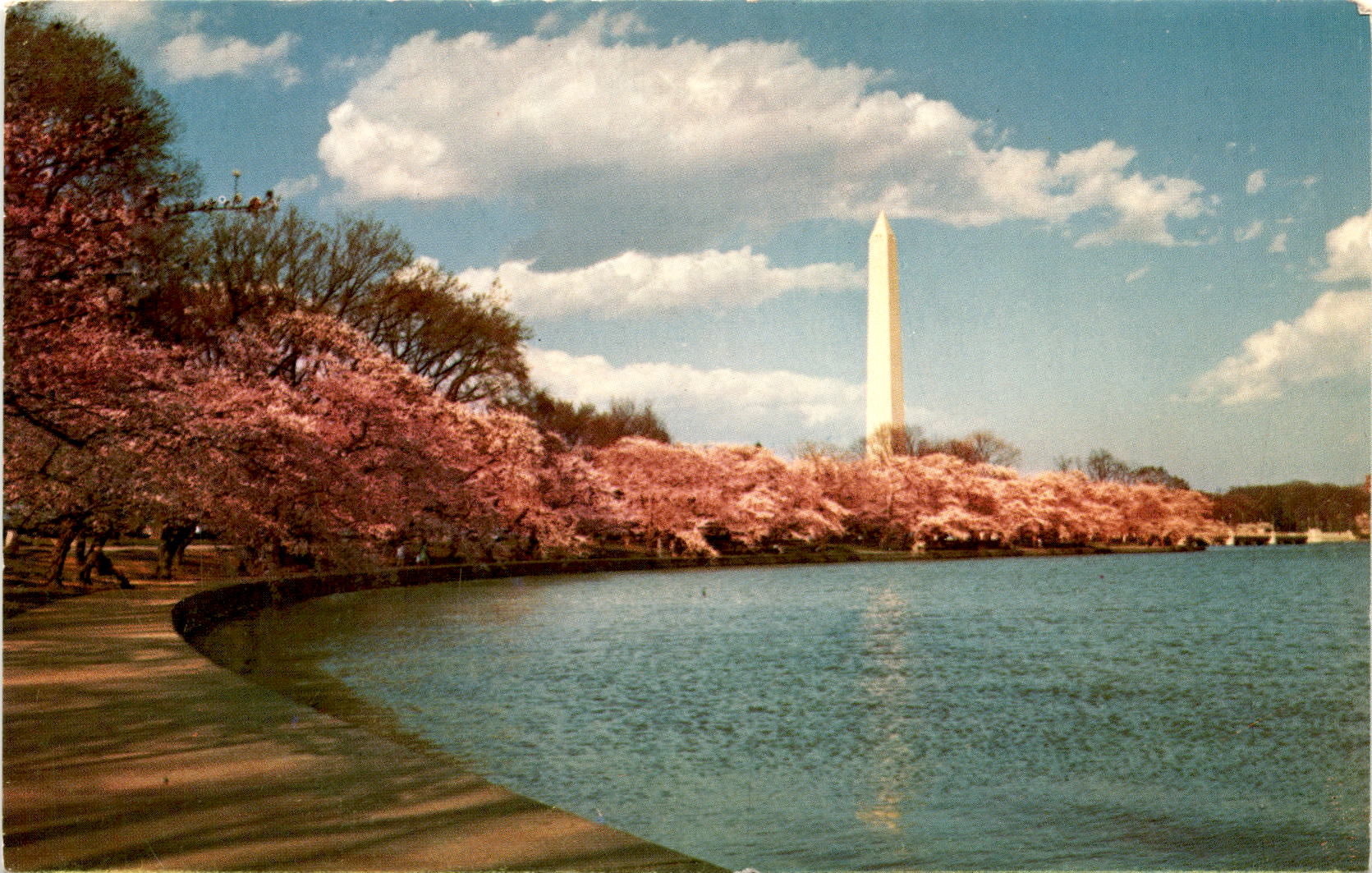 Back of PostcardThe front of the postcard features a stunning image of the Washington Monument, a white marble shaft that stands at 555 feet tall. The postcard mentions that visitors can reach the top of the monument by elevator in just 70 seconds, providing a quick and convenient way to take in the views of the city. Additionally, it notes that the cherry trees surrounding the monument typically bloom early in April, adding a beautiful touch to the landscape.
