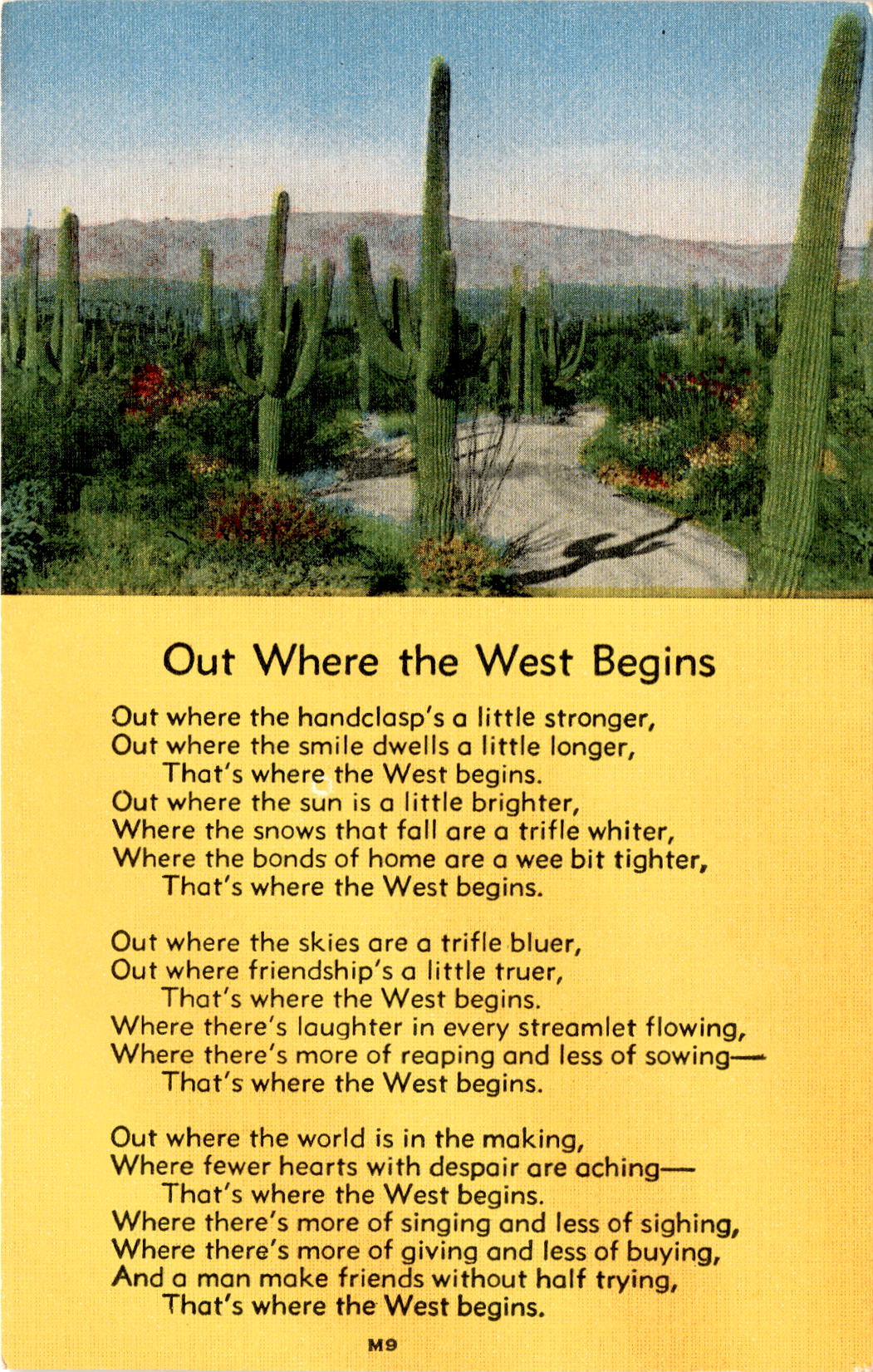 The front of the postcard paints a vivid picture of the West, describing it as a place where the handclasp is stronger, the smile lasts longer, and the sun shines brighter. It emphasizes the sense of community and connection that can be found in the West, where bonds of home are tighter and friendships are truer. The poem captures the essence of the West as a place of beauty, laughter, and optimism.