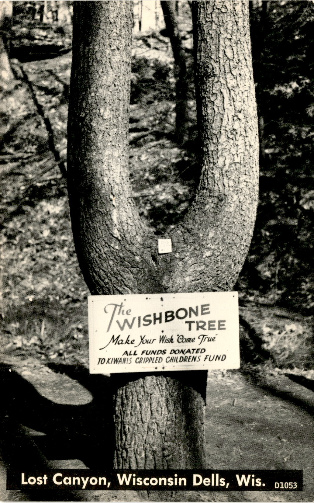 The front of the postcard features a picture of the Wishbone Tree at Lost Canyon in Wisconsin Dells, with the message “Make Your Wish Come True” written above it. The postcard states that all funds donated for making a wish on the tree will go to the Kiwanis Crippled Children’s Fund. The photo was taken by John A. Trumble and the postcard was published by DELLS PHOTO SERVICE in Wisconsin Dells.