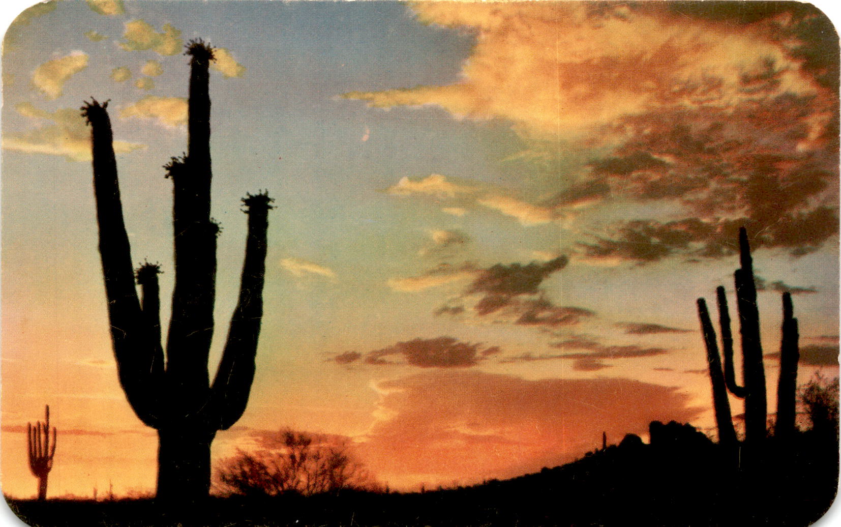 The front of this postcard features a stunning image of an Arizona sunset, showcasing the beautiful blending of the desert landscape with the colorful sky. The colors are vibrant and captivating, drawing the observer in and creating a sense of awe and wonder. The photographer, Jerry McLain, has expertly captured the beauty and majesty of the Arizona sunset, making it a moment that won’t soon be forgotten.On the back of the postcard, we see that it is a natural color card published and distributed by Bob Petley in Phoenix, Arizona. The use of Kodachrome film by Jerry McLain has resulted in a high-quality image that truly captures the essence of the Arizona sunset. The postcard serves as a memento of this awe-inspiring moment in nature, allowing the observer to take a piece of the beauty home with them.Overall, this postcard is a beautiful representation of the natural beauty found in Arizona. The front image of the sunset is breathtaking, while the back provides information about the photographer and publisher. It serves as a reminder of the incredible sights that can be found in the desert landscape of Arizona, and is sure to be cherished by anyone who receives it.