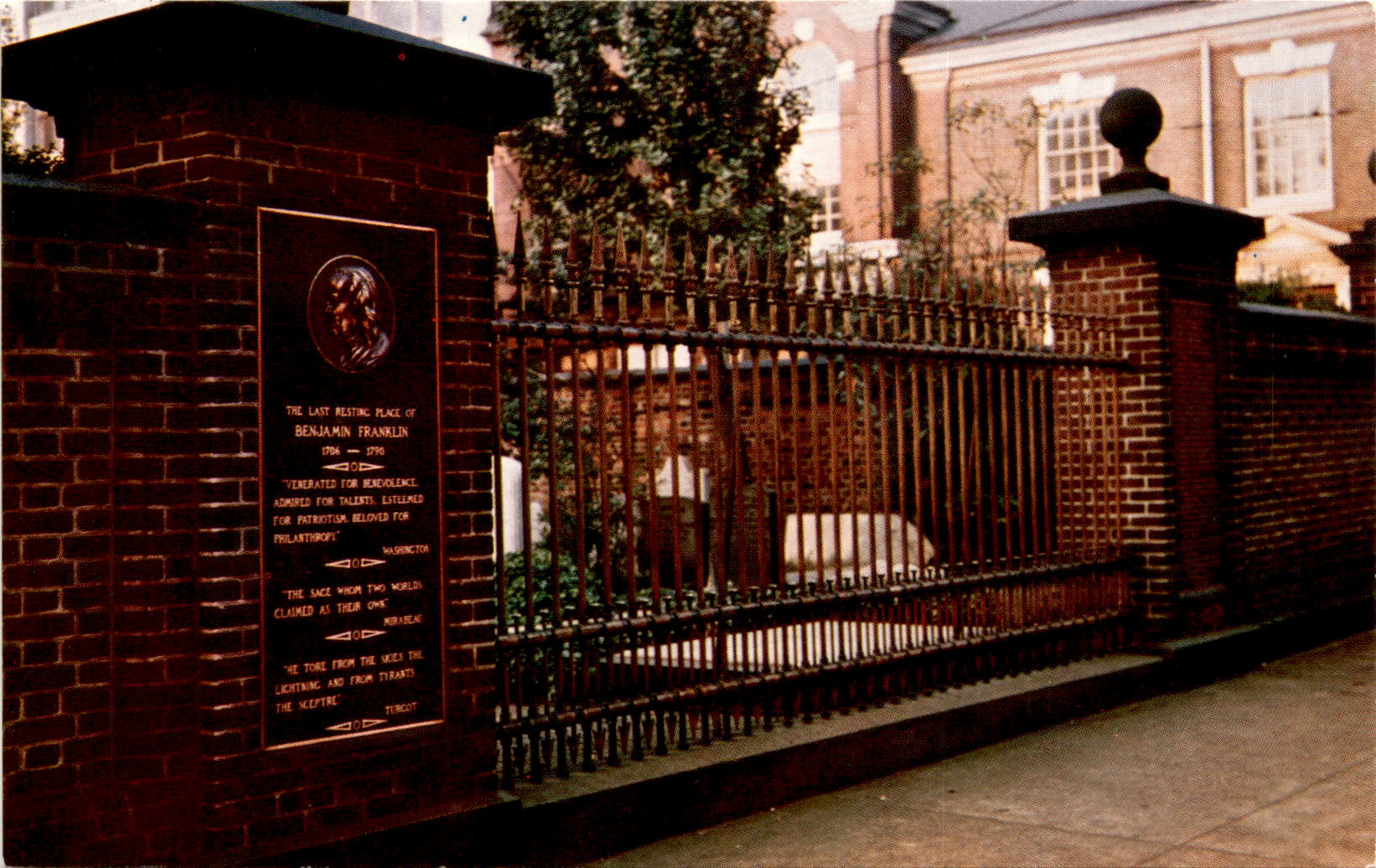The front of this postcard features a beautiful image of Benjamin Franklin’s grave, located at the southeast corner of 5th & Arch Streets in the old burial ground of Christ Church in Philadelphia. The postcard pays tribute to Franklin, highlighting his many virtues such as benevolence, talent, patriotism, and philanthropy. The image captures the serene and peaceful atmosphere of the final resting place of one of America’s founding fathers.On the back of the postcard, there is a brief description of Benjamin Franklin’s legacy, emphasizing his contributions to both the United States and the world. Franklin is described as a man who tore from the skies the lightning and from tyrants the sceptre, highlighting his achievements as a scientist, inventor, and statesman. The postcard also includes information about the location of Franklin’s grave and the original color photograph from which the postcard was made.Overall, this postcard serves as a fitting tribute to Benjamin Franklin, showcasing his enduring impact on American history and culture. The image of his grave, along with the thoughtful description on the back, invites viewers to reflect on Franklin’s remarkable life and legacy. Whether sent as a souvenir or kept as a memento, this postcard is a reminder of the lasting influence of one of America’s most beloved figures.