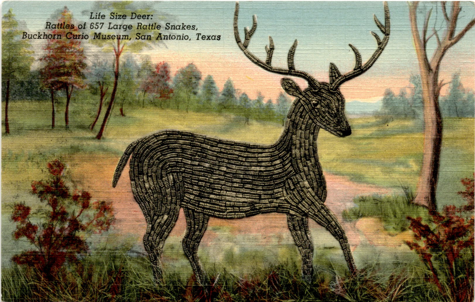 The front of this postcard features a unique and eye-catching design of a life-size deer made up of 657 large Texas diamond-back rattle snake rattles. This intricate design, along with many others made of snake rattles, can be found at the Buckhorn Curio Museum in San Antonio, Texas. The postcard highlights the patient and artistic work of Mrs. Albert Friedrich, who created these stunning pieces. The Buckhorn Curio Museum is a must-visit destination for anyone interested in unique and unusual works of art.On the back of the postcard, we see the classic PLACE STAMP HERE section along with the postcard’s registration number and the printing information. The postcard is a genuine Curteich-Chicago C.T. ART-COLORTONE postcard, known for its high-quality printing and vibrant colors. The back of the postcard provides a glimpse into the history and craftsmanship behind the creation of the life-size deer and other snake rattle designs at the Buckhorn Curio Museum. It serves as a reminder of the dedication and skill of Mrs. Albert Friedrich and the legacy she has left behind.Overall, this postcard is a fascinating glimpse into the world of the Buckhorn Curio Museum and the unique artistry of Mrs. Albert Friedrich. The front showcases the stunning design of the life-size deer made of snake rattles, while the back provides additional information about the museum and the postcard itself. Whether you’re a collector of postcards or a fan of unusual art, this postcard is sure to be a standout addition to your collection.