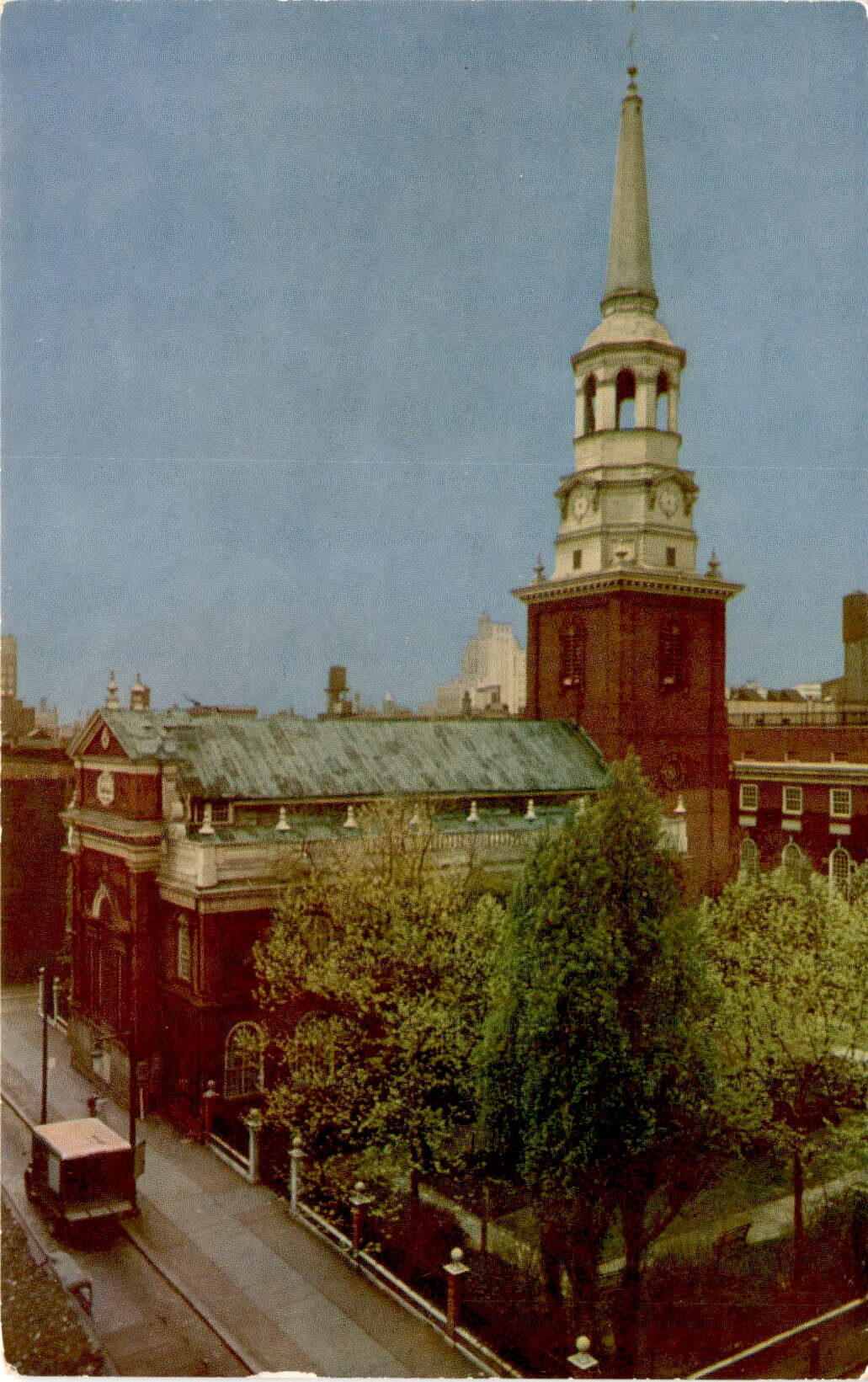 Back of PostcardThe front of this postcard features a beautiful image of Christ Church in Philadelphia, located on 2nd Street above Market. Founded in 1695 and built in 1727, this historic church is an active parish of the Protestant Episcopal Church. The steeple of the church is topped by a Bishop’s Mitre, in honor of Dr. William White who was consecrated Bishop while serving as Rector from 1772-1836. Notable figures such as the signers of the Declaration of Independence, Constitution, and President Washington have worshipped at this church.On the back of the postcard, there is a handwritten note from someone who visited the church. They mention seeing Independence Hall, the Liberty Bell, Ross’s House, and Betsy Ross’s House during their visit to Philadelphia. The postcard also includes a reminder to BUY U.S. S BONDS and to ask your post office about Jefferson 24 U.S. postage. The postcard was published by Kutz in Philadelphia and features original color photographs.Overall, this postcard provides a glimpse into the rich history and architecture of Christ Church in Philadelphia. It serves as a reminder of the important role this church played in the founding of the United States and its significance in American history. The handwritten note on the back adds a personal touch, giving insight into the experiences of someone who visited this historic site.